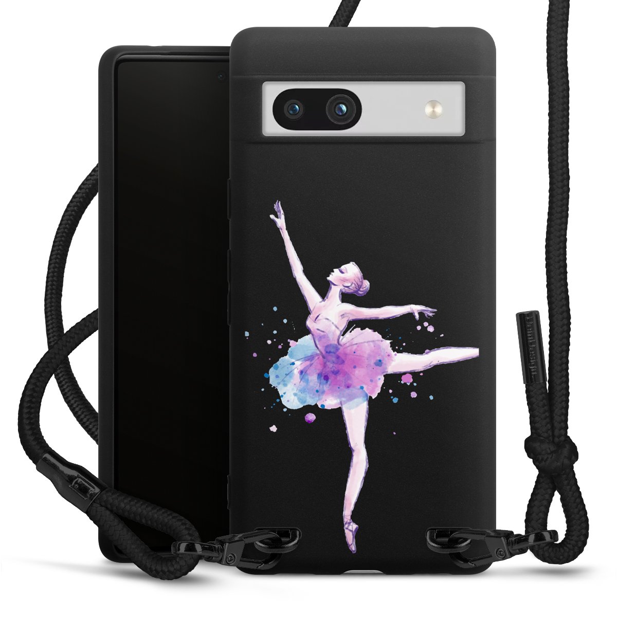 The matt black silicone case is made of flexible TPU (thermoplastic polyurethane) and offers robust protection. The durable, unbreakable material makes the cover flexible and dimensionally stable at the same time. The matte surface makes your design stand out more and is less susceptible to fingerprints and dirt. The stylish trend accessory fits comfortably in the hand and is perfectly complemented by the fabric (polyester) mobile phone strap. The braided fabric strap is approx. 1.70 metres long with a diameter of approx. 0.5 cm. Due to the special knotting technique, the length of the strap can be adjusted by simply pulling it, so that you can adapt it individually to your wishes. The practical case to wear around your neck is available with the fabric strap in black. As a little icing on the cake, we have provided the strap with a chic metal fastener in matt black. The strap is securely fastened to the case with loops made of high-quality genuine leather and press studs. The ends of the fabric strap are covered with metallic end caps and thus protected from fraying.