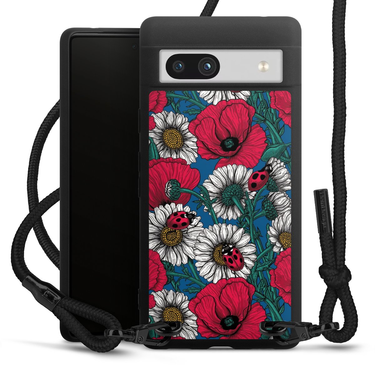 The matt black silicone case is made of flexible TPU (thermoplastic polyurethane) and offers robust protection. The durable, unbreakable material makes the cover flexible and dimensionally stable at the same time. The matte surface makes your design stand out more and is less susceptible to fingerprints and dirt. The stylish trend accessory fits comfortably in the hand and is perfectly complemented by the fabric (polyester) mobile phone strap. The braided fabric strap is approx. 1.70 metres long with a diameter of approx. 0.5 cm. Due to the special knotting technique, the length of the strap can be adjusted by simply pulling it, so that you can adapt it individually to your wishes. The practical case to wear around your neck is available with the fabric strap in black. As a little icing on the cake, we have provided the strap with a chic metal fastener in matt black. The strap is securely fastened to the case with loops made of high-quality genuine leather and press studs. The ends of the fabric strap are covered with metallic end caps and thus protected from fraying.