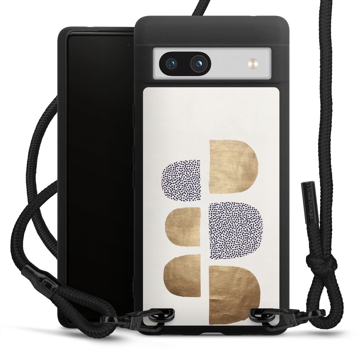 The matt black silicone case is made of flexible TPU (thermoplastic polyurethane) and offers robust protection. The durable, unbreakable material makes the cover flexible and dimensionally stable at the same time. The matte surface makes your design stand out more and is less susceptible to fingerprints and dirt. The stylish trend accessory fits comfortably in the hand and is perfectly complemented by the fabric (polyester) mobile phone strap. The braided fabric strap is approx. 1.70 metres long with a diameter of approx. 0.5 cm. Due to the special knotting technique, the length of the strap can be adjusted by simply pulling it, so that you can adapt it individually to your wishes. The practical case to wear around your neck is available with the fabric strap in black. As a little icing on the cake, we have provided the strap with a chic metal fastener in matt black. The strap is securely fastened to the case with loops made of high-quality genuine leather and press studs. The ends of the fabric strap are covered with metallic end caps and thus protected from fraying.