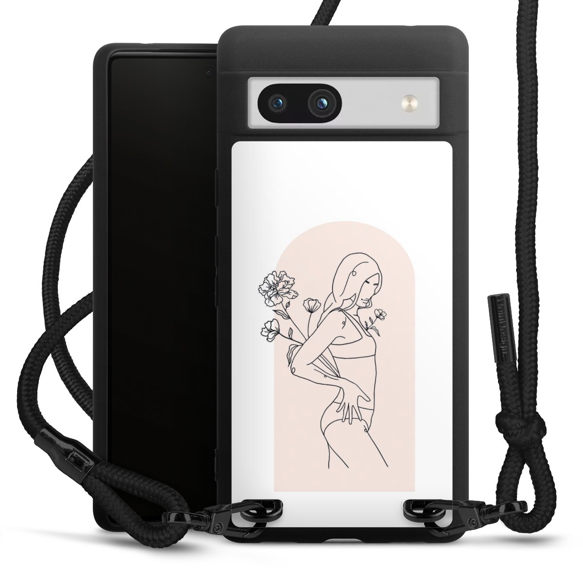 The matt black silicone case is made of flexible TPU (thermoplastic polyurethane) and offers robust protection. The durable, unbreakable material makes the cover flexible and dimensionally stable at the same time. The matte surface makes your design stand out more and is less susceptible to fingerprints and dirt. The stylish trend accessory fits comfortably in the hand and is perfectly complemented by the fabric (polyester) mobile phone strap. The braided fabric strap is approx. 1.70 metres long with a diameter of approx. 0.5 cm. Due to the special knotting technique, the length of the strap can be adjusted by simply pulling it, so that you can adapt it individually to your wishes. The practical case to wear around your neck is available with the fabric strap in black. As a little icing on the cake, we have provided the strap with a chic metal fastener in matt black. The strap is securely fastened to the case with loops made of high-quality genuine leather and press studs. The ends of the fabric strap are covered with metallic end caps and thus protected from fraying.