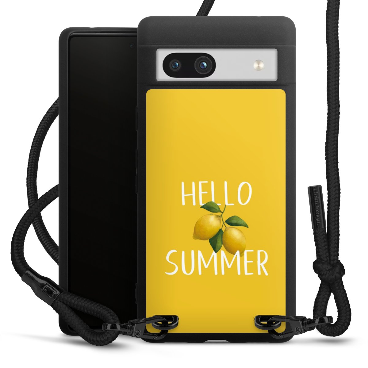 The matt black silicone case is made of flexible TPU (thermoplastic polyurethane) and offers robust protection. The durable, unbreakable material makes the cover flexible and dimensionally stable at the same time. The matte surface makes your design stand out more and is less susceptible to fingerprints and dirt. The stylish trend accessory fits comfortably in the hand and is perfectly complemented by the fabric (polyester) mobile phone strap. The braided fabric strap is approx. 1.70 metres long with a diameter of approx. 0.5 cm. Due to the special knotting technique, the length of the strap can be adjusted by simply pulling it, so that you can adapt it individually to your wishes. The practical case to wear around your neck is available with the fabric strap in black. As a little icing on the cake, we have provided the strap with a chic metal fastener in matt black. The strap is securely fastened to the case with loops made of high-quality genuine leather and press studs. The ends of the fabric strap are covered with metallic end caps and thus protected from fraying.