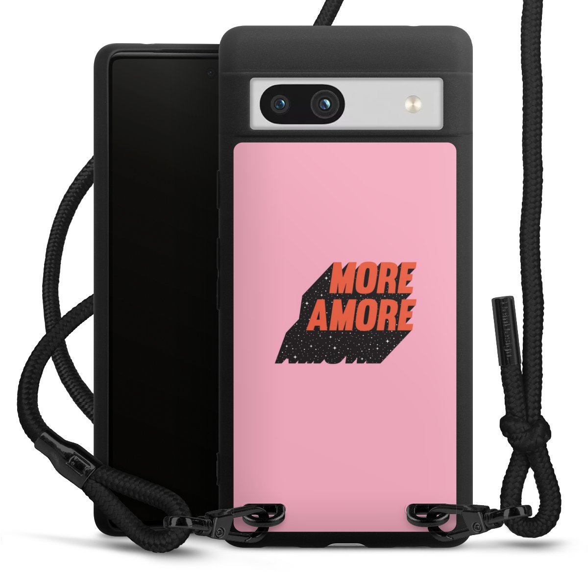 The matt black silicone case is made of flexible TPU (thermoplastic polyurethane) and offers robust protection. The durable, unbreakable material makes the cover flexible and dimensionally stable at the same time. The matte surface makes your design stand out more and is less susceptible to fingerprints and dirt. The stylish trend accessory fits comfortably in the hand and is perfectly complemented by the fabric (polyester) mobile phone strap. The braided fabric strap is approx. 1.70 metres long with a diameter of approx. 0.5 cm. Due to the special knotting technique, the length of the strap can be adjusted by simply pulling it, so that you can adapt it individually to your wishes. The practical case to wear around your neck is available with the fabric strap in black. As a little icing on the cake, we have provided the strap with a chic metal fastener in matt black. The strap is securely fastened to the case with loops made of high-quality genuine leather and press studs. The ends of the fabric strap are covered with metallic end caps and thus protected from fraying.