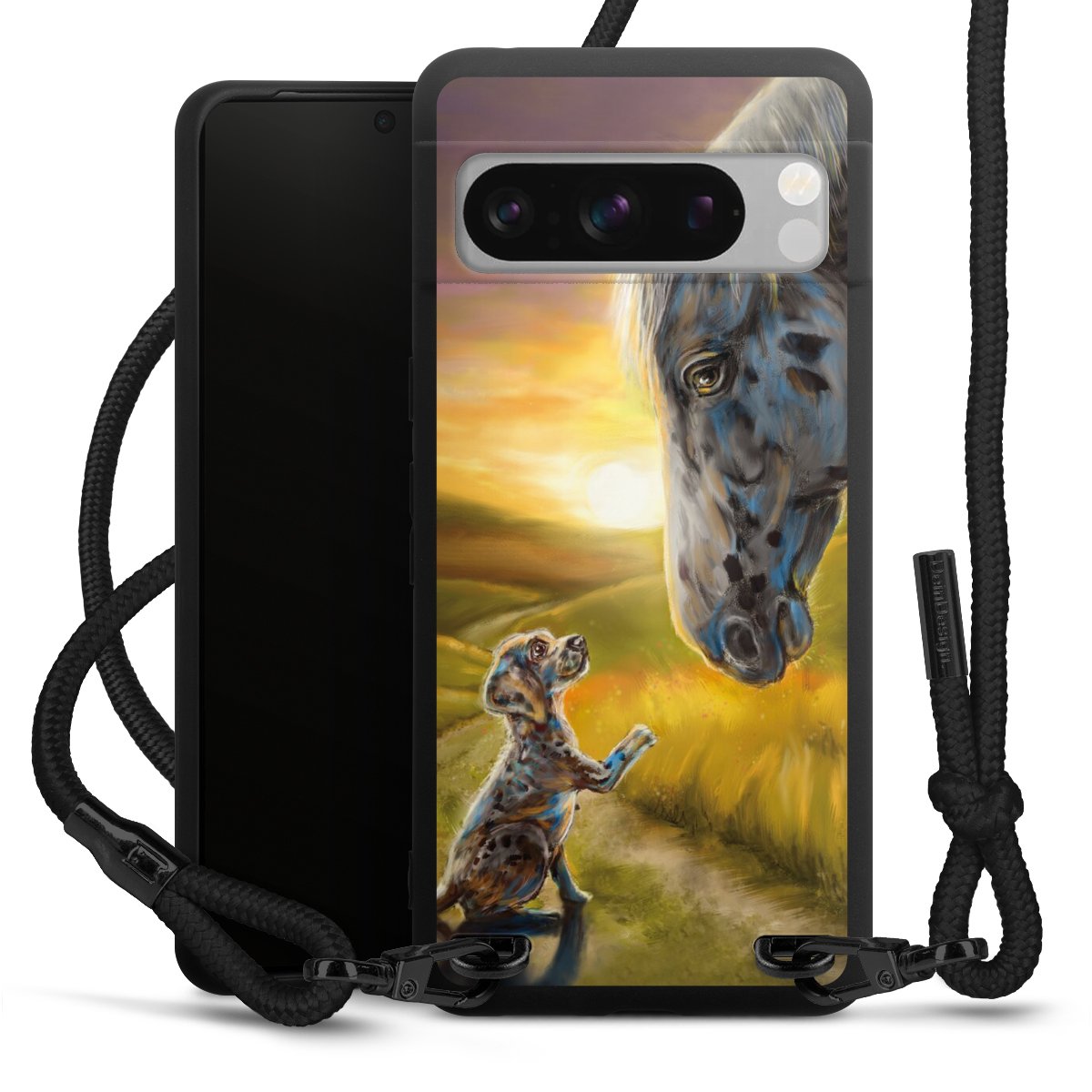 The matt black silicone case is made of flexible TPU (thermoplastic polyurethane) and offers robust protection. The durable, unbreakable material makes the cover flexible and dimensionally stable at the same time. The matte surface makes your design stand out more and is less susceptible to fingerprints and dirt. The stylish trend accessory fits comfortably in the hand and is perfectly complemented by the fabric (polyester) mobile phone strap. The braided fabric strap is approx. 1.70 metres long with a diameter of approx. 0.5 cm. Due to the special knotting technique, the length of the strap can be adjusted by simply pulling it, so that you can adapt it individually to your wishes. The practical case to wear around your neck is available with the fabric strap in black. As a little icing on the cake, we have provided the strap with a chic metal fastener in matt black. The strap is securely fastened to the case with loops made of high-quality genuine leather and press studs. The ends of the fabric strap are covered with metallic end caps and thus protected from fraying.