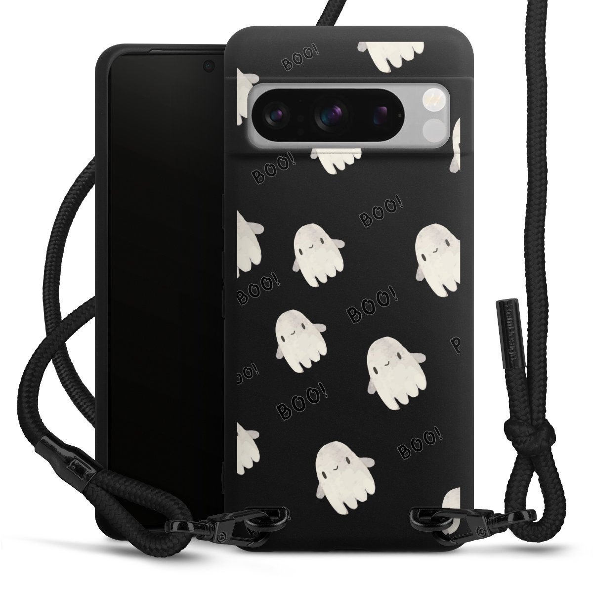 The matt black silicone case is made of flexible TPU (thermoplastic polyurethane) and offers robust protection. The durable, unbreakable material makes the cover flexible and dimensionally stable at the same time. The matte surface makes your design stand out more and is less susceptible to fingerprints and dirt. The stylish trend accessory fits comfortably in the hand and is perfectly complemented by the fabric (polyester) mobile phone strap. The braided fabric strap is approx. 1.70 metres long with a diameter of approx. 0.5 cm. Due to the special knotting technique, the length of the strap can be adjusted by simply pulling it, so that you can adapt it individually to your wishes. The practical case to wear around your neck is available with the fabric strap in black. As a little icing on the cake, we have provided the strap with a chic metal fastener in matt black. The strap is securely fastened to the case with loops made of high-quality genuine leather and press studs. The ends of the fabric strap are covered with metallic end caps and thus protected from fraying.