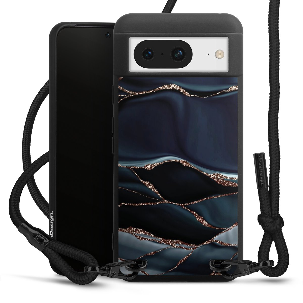 The matt black silicone case is made of flexible TPU (thermoplastic polyurethane) and offers robust protection. The durable, unbreakable material makes the cover flexible and dimensionally stable at the same time. The matte surface makes your design stand out more and is less susceptible to fingerprints and dirt. The stylish trend accessory fits comfortably in the hand and is perfectly complemented by the fabric (polyester) mobile phone strap. The braided fabric strap is approx. 1.70 metres long with a diameter of approx. 0.5 cm. Due to the special knotting technique, the length of the strap can be adjusted by simply pulling it, so that you can adapt it individually to your wishes. The practical case to wear around your neck is available with the fabric strap in black. As a little icing on the cake, we have provided the strap with a chic metal fastener in matt black. The strap is securely fastened to the case with loops made of high-quality genuine leather and press studs. The ends of the fabric strap are covered with metallic end caps and thus protected from fraying.