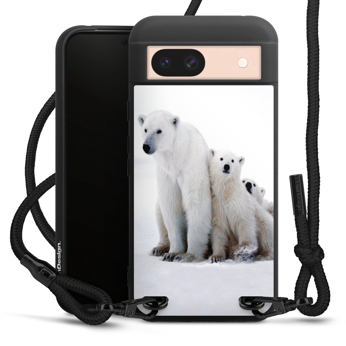 The matt black silicone case is made of flexible TPU (thermoplastic polyurethane) and offers robust protection. The durable, unbreakable material makes the cover flexible and dimensionally stable at the same time. The matte surface makes your design stand out more and is less susceptible to fingerprints and dirt. The stylish trend accessory fits comfortably in the hand and is perfectly complemented by the fabric (polyester) mobile phone strap. The braided fabric strap is approx. 1.70 metres long with a diameter of approx. 0.5 cm. Due to the special knotting technique, the length of the strap can be adjusted by simply pulling it, so that you can adapt it individually to your wishes. The practical case to wear around your neck is available with the fabric strap in black. As a little icing on the cake, we have provided the strap with a chic metal fastener in matt black. The strap is securely fastened to the case with loops made of high-quality genuine leather and press studs. The ends of the fabric strap are covered with metallic end caps and thus protected from fraying.