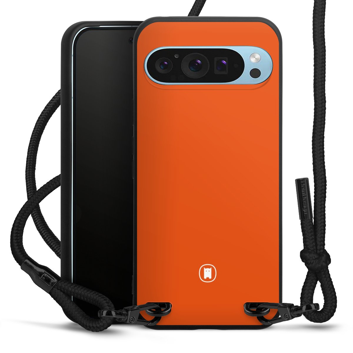 The matt black silicone case is made of flexible TPU (thermoplastic polyurethane) and offers robust protection. The durable, unbreakable material makes the cover flexible and dimensionally stable at the same time. The matte surface makes your design stand out more and is less susceptible to fingerprints and dirt. The stylish trend accessory fits comfortably in the hand and is perfectly complemented by the fabric (polyester) mobile phone strap. The braided fabric strap is approx. 1.70 metres long with a diameter of approx. 0.5 cm. Due to the special knotting technique, the length of the strap can be adjusted by simply pulling it, so that you can adapt it individually to your wishes. The practical case to wear around your neck is available with the fabric strap in black. As a little icing on the cake, we have provided the strap with a chic metal fastener in matt black. The strap is securely fastened to the case with loops made of high-quality genuine leather and press studs. The ends of the fabric strap are covered with metallic end caps and thus protected from fraying.