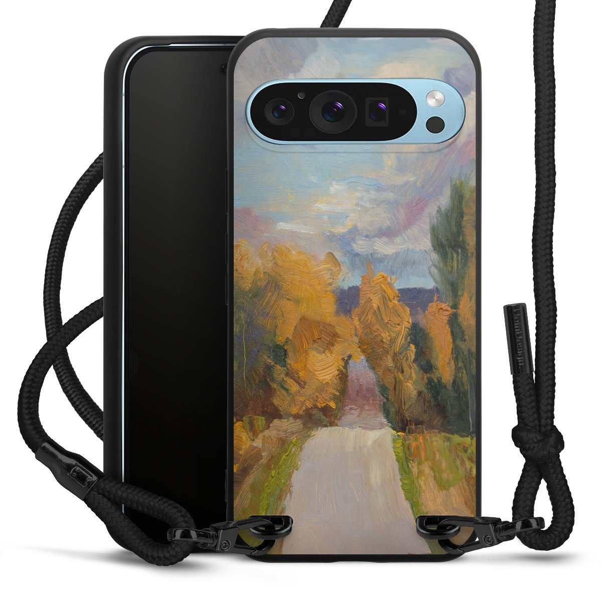 The matt black silicone case is made of flexible TPU (thermoplastic polyurethane) and offers robust protection. The durable, unbreakable material makes the cover flexible and dimensionally stable at the same time. The matte surface makes your design stand out more and is less susceptible to fingerprints and dirt. The stylish trend accessory fits comfortably in the hand and is perfectly complemented by the fabric (polyester) mobile phone strap. The braided fabric strap is approx. 1.70 metres long with a diameter of approx. 0.5 cm. Due to the special knotting technique, the length of the strap can be adjusted by simply pulling it, so that you can adapt it individually to your wishes. The practical case to wear around your neck is available with the fabric strap in black. As a little icing on the cake, we have provided the strap with a chic metal fastener in matt black. The strap is securely fastened to the case with loops made of high-quality genuine leather and press studs. The ends of the fabric strap are covered with metallic end caps and thus protected from fraying.