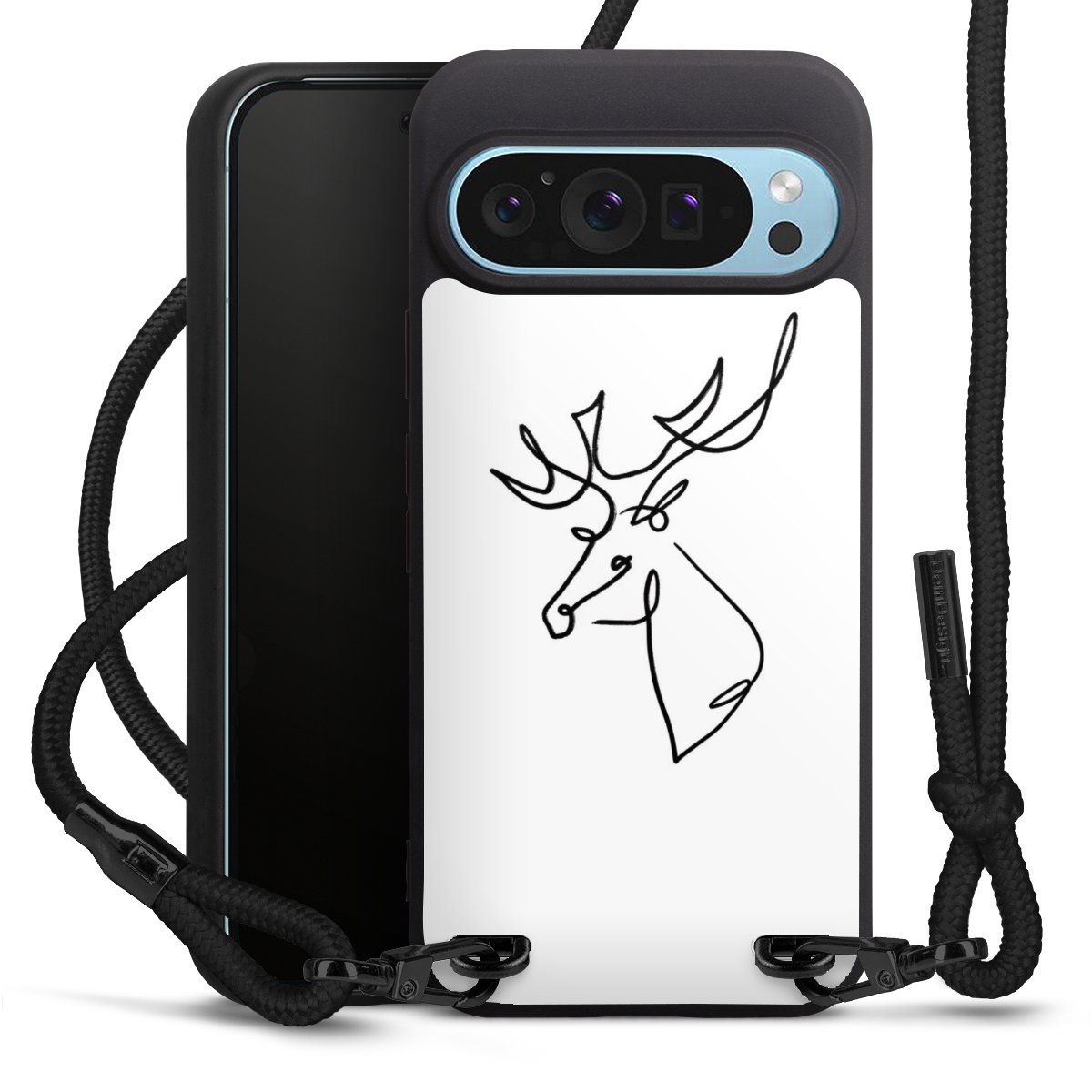 The matt black silicone case is made of flexible TPU (thermoplastic polyurethane) and offers robust protection. The durable, unbreakable material makes the cover flexible and dimensionally stable at the same time. The matte surface makes your design stand out more and is less susceptible to fingerprints and dirt. The stylish trend accessory fits comfortably in the hand and is perfectly complemented by the fabric (polyester) mobile phone strap. The braided fabric strap is approx. 1.70 metres long with a diameter of approx. 0.5 cm. Due to the special knotting technique, the length of the strap can be adjusted by simply pulling it, so that you can adapt it individually to your wishes. The practical case to wear around your neck is available with the fabric strap in black. As a little icing on the cake, we have provided the strap with a chic metal fastener in matt black. The strap is securely fastened to the case with loops made of high-quality genuine leather and press studs. The ends of the fabric strap are covered with metallic end caps and thus protected from fraying.