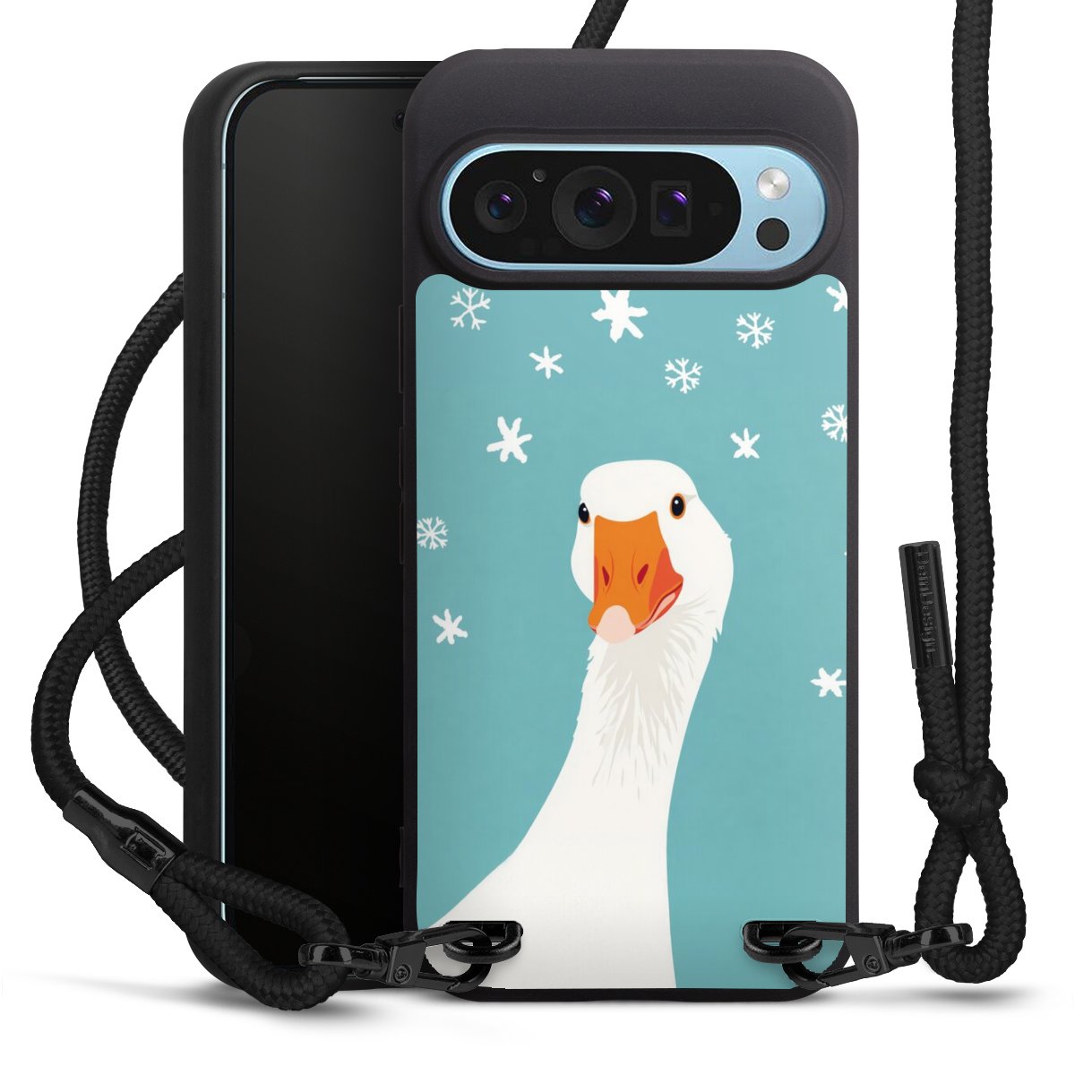 The matt black silicone case is made of flexible TPU (thermoplastic polyurethane) and offers robust protection. The durable, unbreakable material makes the cover flexible and dimensionally stable at the same time. The matte surface makes your design stand out more and is less susceptible to fingerprints and dirt. The stylish trend accessory fits comfortably in the hand and is perfectly complemented by the fabric (polyester) mobile phone strap. The braided fabric strap is approx. 1.70 metres long with a diameter of approx. 0.5 cm. Due to the special knotting technique, the length of the strap can be adjusted by simply pulling it, so that you can adapt it individually to your wishes. The practical case to wear around your neck is available with the fabric strap in black. As a little icing on the cake, we have provided the strap with a chic metal fastener in matt black. The strap is securely fastened to the case with loops made of high-quality genuine leather and press studs. The ends of the fabric strap are covered with metallic end caps and thus protected from fraying.