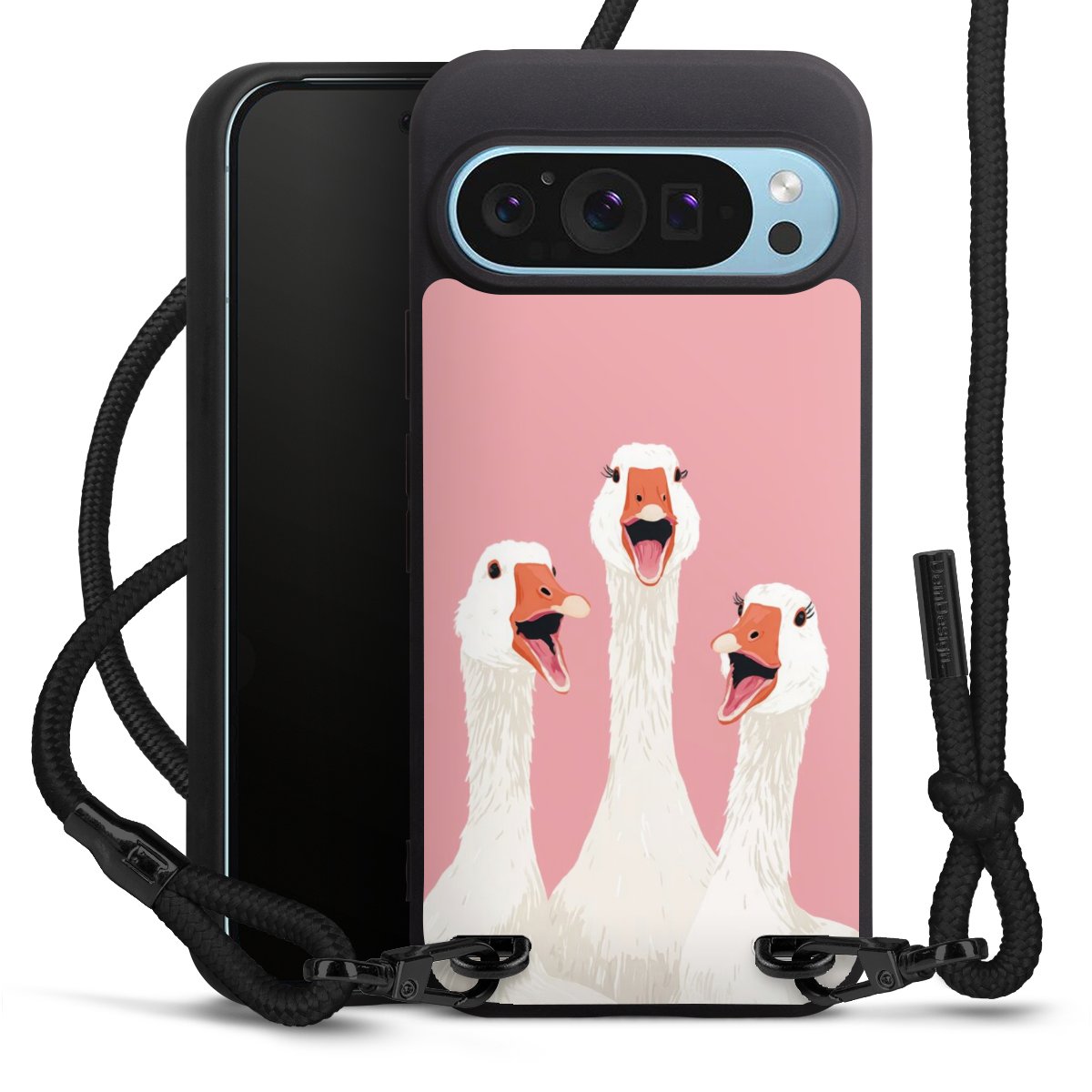 The matt black silicone case is made of flexible TPU (thermoplastic polyurethane) and offers robust protection. The durable, unbreakable material makes the cover flexible and dimensionally stable at the same time. The matte surface makes your design stand out more and is less susceptible to fingerprints and dirt. The stylish trend accessory fits comfortably in the hand and is perfectly complemented by the fabric (polyester) mobile phone strap. The braided fabric strap is approx. 1.70 metres long with a diameter of approx. 0.5 cm. Due to the special knotting technique, the length of the strap can be adjusted by simply pulling it, so that you can adapt it individually to your wishes. The practical case to wear around your neck is available with the fabric strap in black. As a little icing on the cake, we have provided the strap with a chic metal fastener in matt black. The strap is securely fastened to the case with loops made of high-quality genuine leather and press studs. The ends of the fabric strap are covered with metallic end caps and thus protected from fraying.