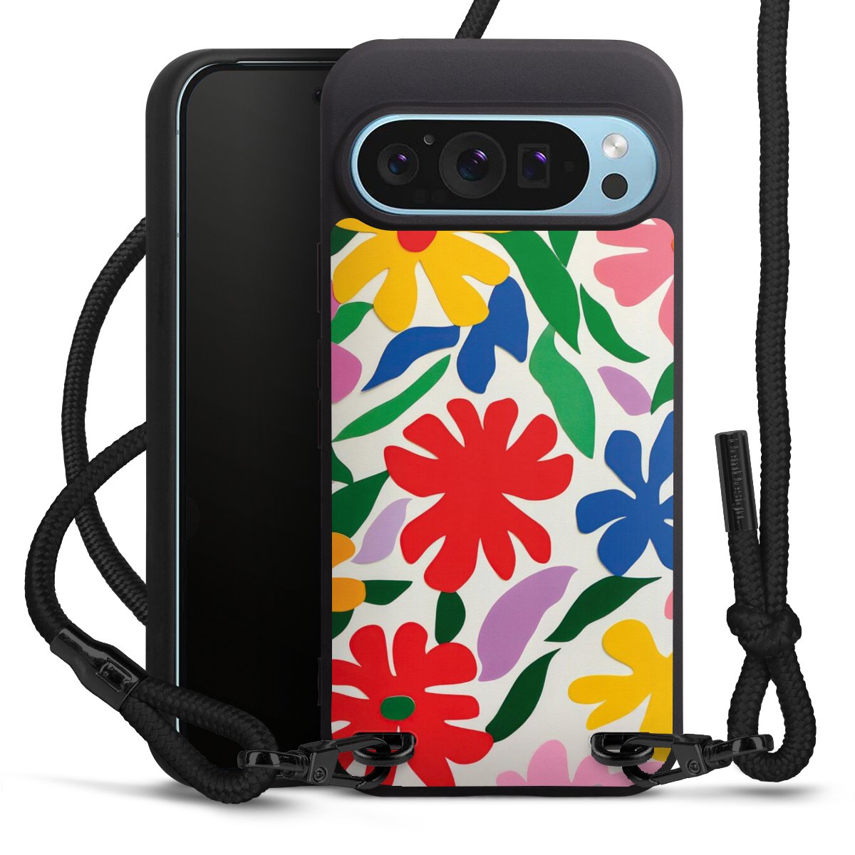 The matt black silicone case is made of flexible TPU (thermoplastic polyurethane) and offers robust protection. The durable, unbreakable material makes the cover flexible and dimensionally stable at the same time. The matte surface makes your design stand out more and is less susceptible to fingerprints and dirt. The stylish trend accessory fits comfortably in the hand and is perfectly complemented by the fabric (polyester) mobile phone strap. The braided fabric strap is approx. 1.70 metres long with a diameter of approx. 0.5 cm. Due to the special knotting technique, the length of the strap can be adjusted by simply pulling it, so that you can adapt it individually to your wishes. The practical case to wear around your neck is available with the fabric strap in black. As a little icing on the cake, we have provided the strap with a chic metal fastener in matt black. The strap is securely fastened to the case with loops made of high-quality genuine leather and press studs. The ends of the fabric strap are covered with metallic end caps and thus protected from fraying.