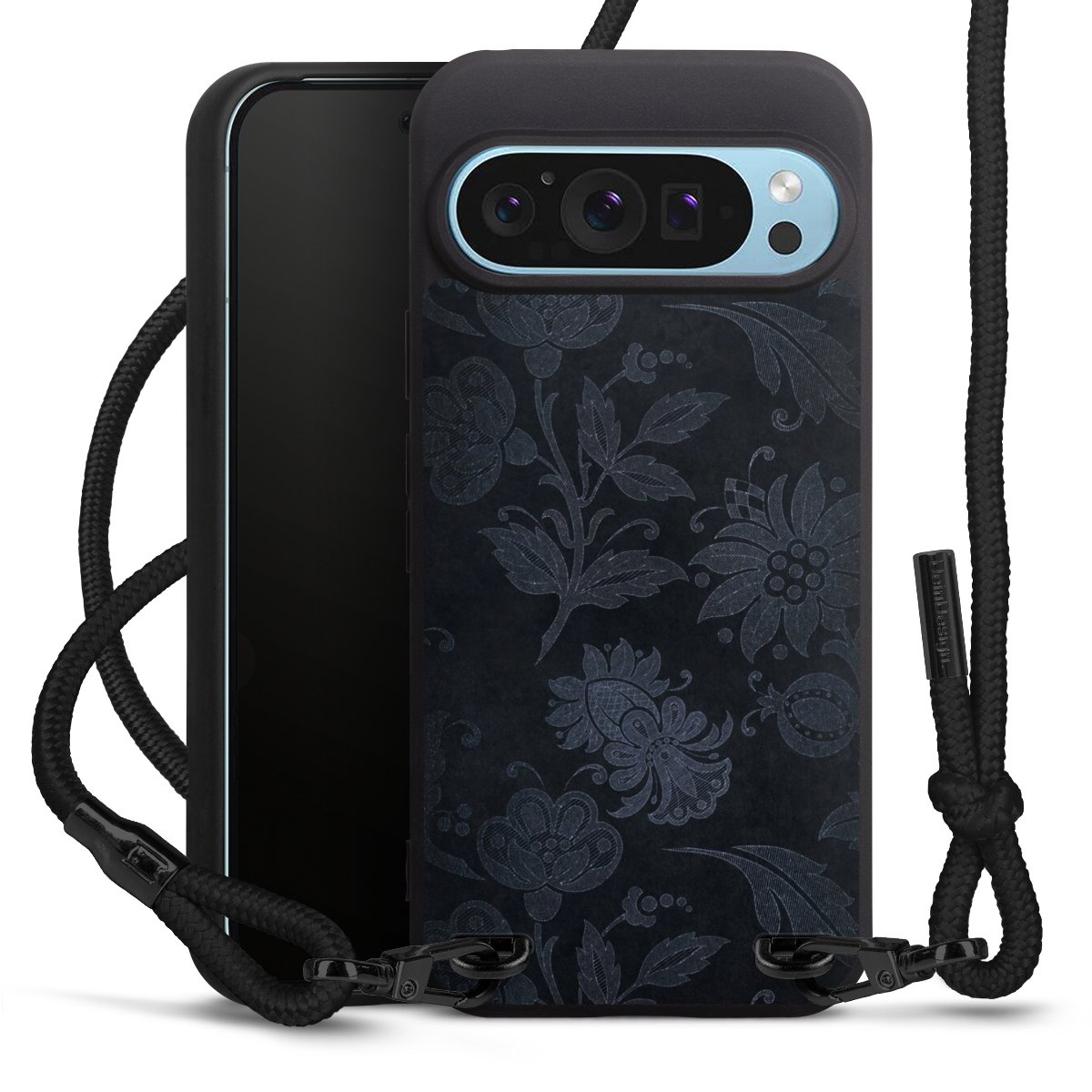Pure Black: Phone case, fabric strap and metal details in stylish matt black.