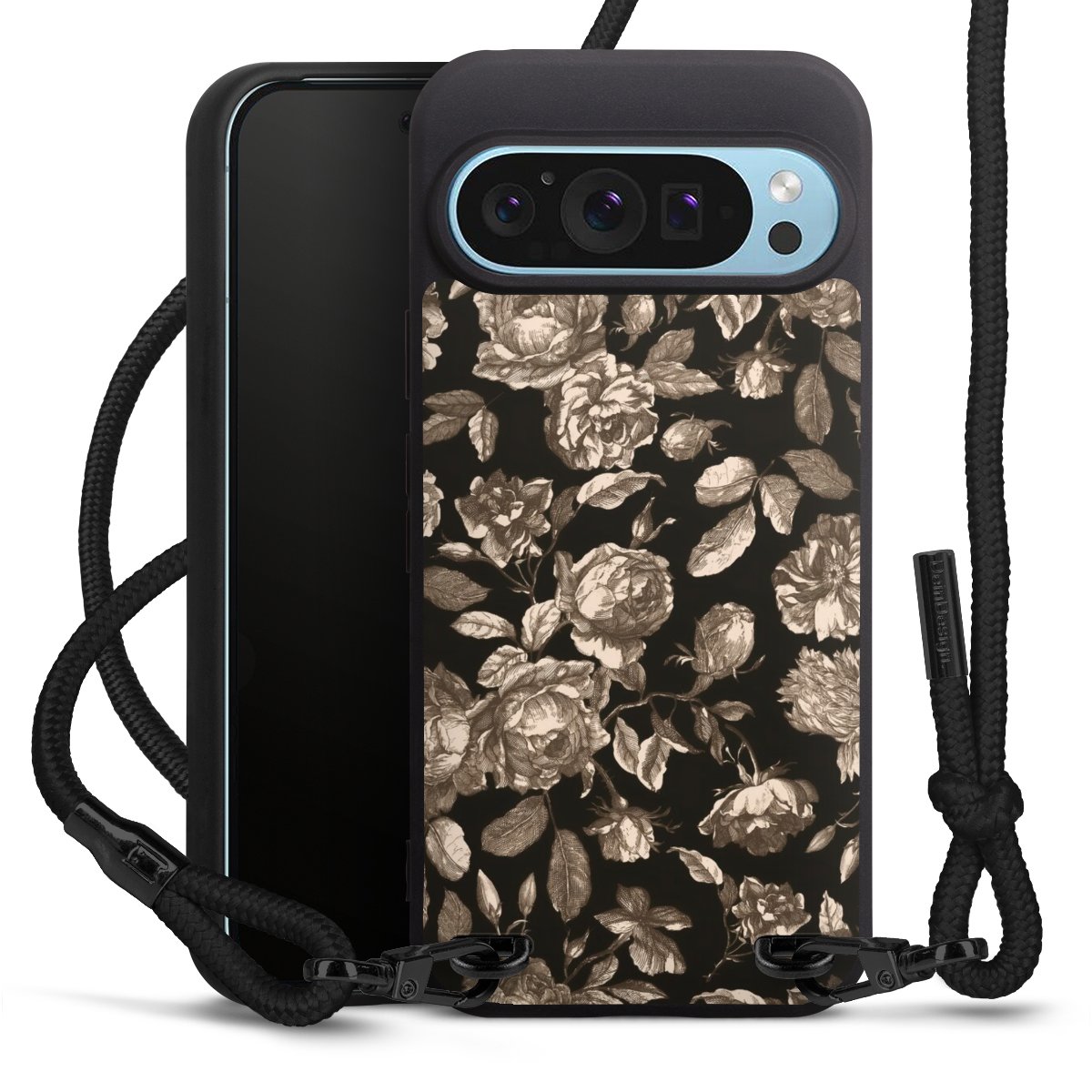 The matt black silicone case is made of flexible TPU (thermoplastic polyurethane) and offers robust protection. The durable, unbreakable material makes the cover flexible and dimensionally stable at the same time. The matte surface makes your design stand out more and is less susceptible to fingerprints and dirt. The stylish trend accessory fits comfortably in the hand and is perfectly complemented by the fabric (polyester) mobile phone strap. The braided fabric strap is approx. 1.70 metres long with a diameter of approx. 0.5 cm. Due to the special knotting technique, the length of the strap can be adjusted by simply pulling it, so that you can adapt it individually to your wishes. The practical case to wear around your neck is available with the fabric strap in black. As a little icing on the cake, we have provided the strap with a chic metal fastener in matt black. The strap is securely fastened to the case with loops made of high-quality genuine leather and press studs. The ends of the fabric strap are covered with metallic end caps and thus protected from fraying.