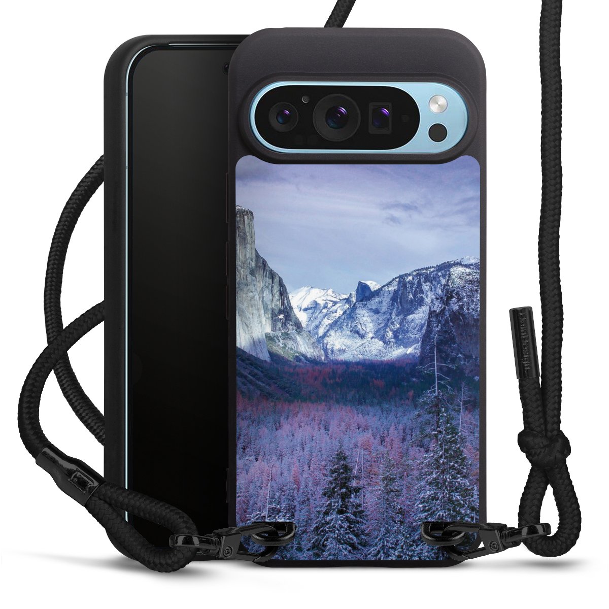 Pure Black: Phone case, fabric strap and metal details in stylish matt black.