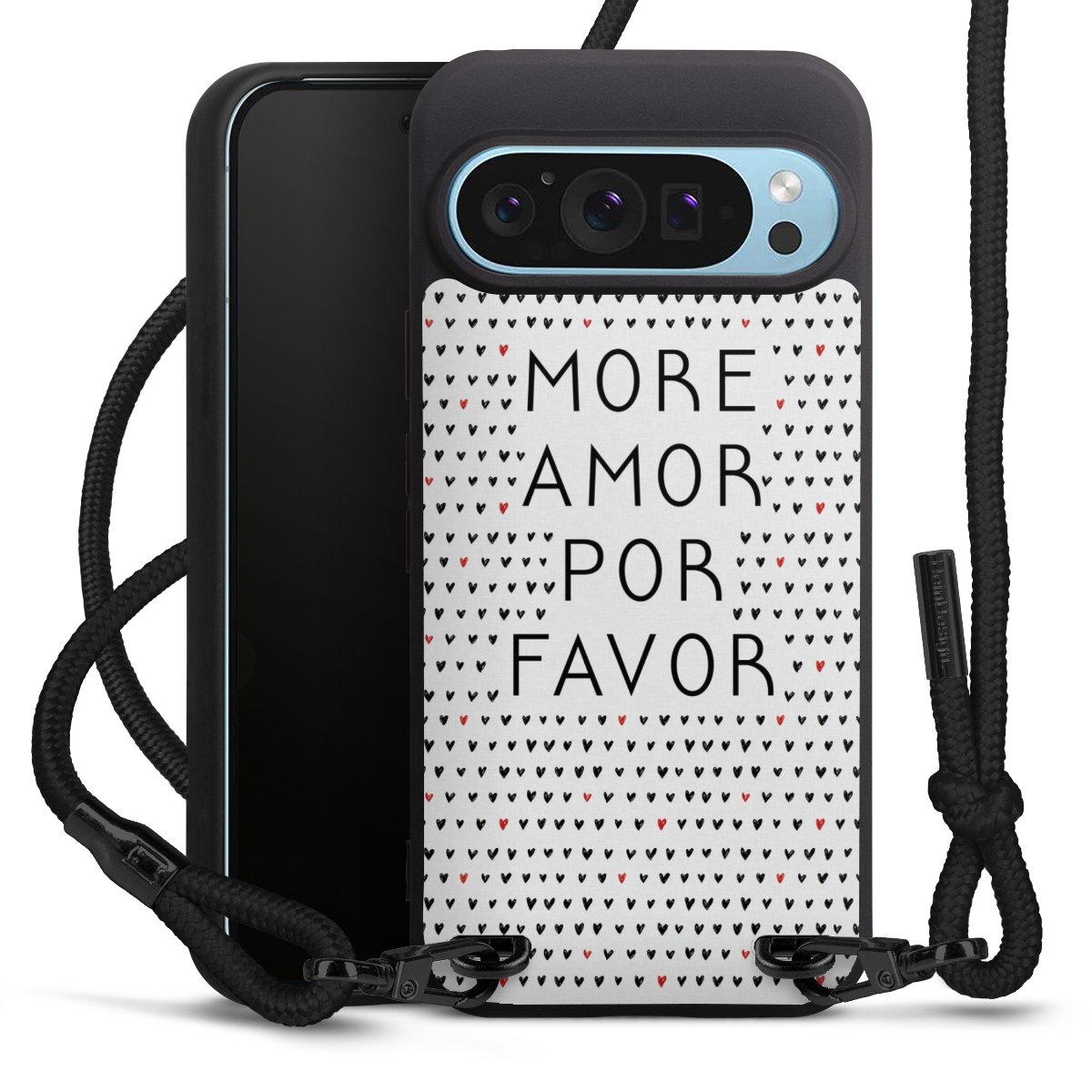 The matt black silicone case is made of flexible TPU (thermoplastic polyurethane) and offers robust protection. The durable, unbreakable material makes the cover flexible and dimensionally stable at the same time. The matte surface makes your design stand out more and is less susceptible to fingerprints and dirt. The stylish trend accessory fits comfortably in the hand and is perfectly complemented by the fabric (polyester) mobile phone strap. The braided fabric strap is approx. 1.70 metres long with a diameter of approx. 0.5 cm. Due to the special knotting technique, the length of the strap can be adjusted by simply pulling it, so that you can adapt it individually to your wishes. The practical case to wear around your neck is available with the fabric strap in black. As a little icing on the cake, we have provided the strap with a chic metal fastener in matt black. The strap is securely fastened to the case with loops made of high-quality genuine leather and press studs. The ends of the fabric strap are covered with metallic end caps and thus protected from fraying.