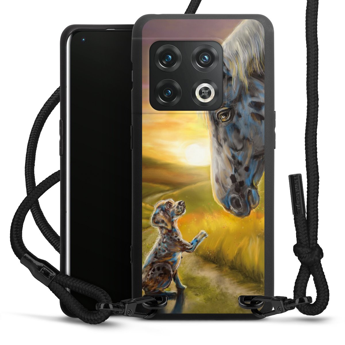 The matt black silicone case is made of flexible TPU (thermoplastic polyurethane) and offers robust protection. The durable, unbreakable material makes the cover flexible and dimensionally stable at the same time. The matte surface makes your design stand out more and is less susceptible to fingerprints and dirt. The stylish trend accessory fits comfortably in the hand and is perfectly complemented by the fabric (polyester) mobile phone strap. The braided fabric strap is approx. 1.70 metres long with a diameter of approx. 0.5 cm. Due to the special knotting technique, the length of the strap can be adjusted by simply pulling it, so that you can adapt it individually to your wishes. The practical case to wear around your neck is available with the fabric strap in black. As a little icing on the cake, we have provided the strap with a chic metal fastener in matt black. The strap is securely fastened to the case with loops made of high-quality genuine leather and press studs. The ends of the fabric strap are covered with metallic end caps and thus protected from fraying.
