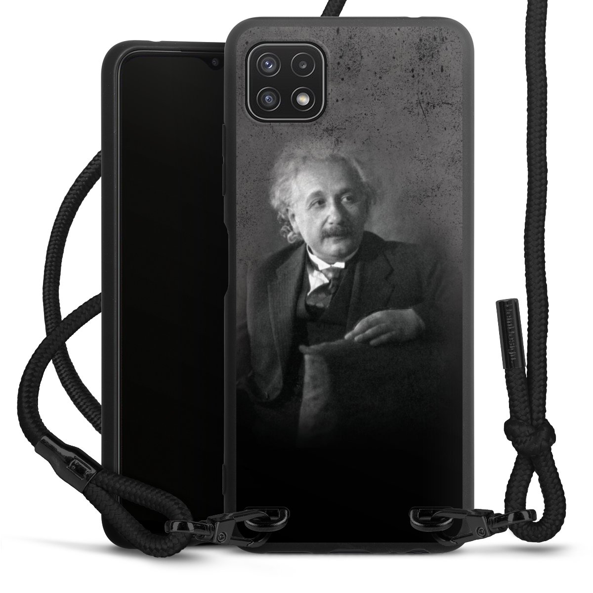 The matt black silicone case is made of flexible TPU (thermoplastic polyurethane) and offers robust protection. The durable, unbreakable material makes the cover flexible and dimensionally stable at the same time. The matte surface makes your design stand out more and is less susceptible to fingerprints and dirt. The stylish trend accessory fits comfortably in the hand and is perfectly complemented by the fabric (polyester) mobile phone strap. The braided fabric strap is approx. 1.70 metres long with a diameter of approx. 0.5 cm. Due to the special knotting technique, the length of the strap can be adjusted by simply pulling it, so that you can adapt it individually to your wishes. The practical case to wear around your neck is available with the fabric strap in black. As a little icing on the cake, we have provided the strap with a chic metal fastener in matt black. The strap is securely fastened to the case with loops made of high-quality genuine leather and press studs. The ends of the fabric strap are covered with metallic end caps and thus protected from fraying.