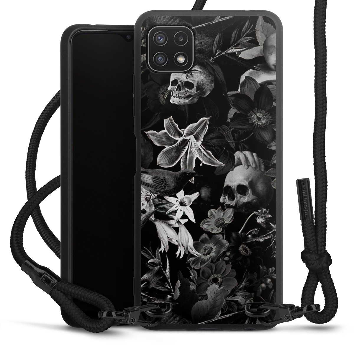 The matt black silicone case is made of flexible TPU (thermoplastic polyurethane) and offers robust protection. The durable, unbreakable material makes the cover flexible and dimensionally stable at the same time. The matte surface makes your design stand out more and is less susceptible to fingerprints and dirt. The stylish trend accessory fits comfortably in the hand and is perfectly complemented by the fabric (polyester) mobile phone strap. The braided fabric strap is approx. 1.70 metres long with a diameter of approx. 0.5 cm. Due to the special knotting technique, the length of the strap can be adjusted by simply pulling it, so that you can adapt it individually to your wishes. The practical case to wear around your neck is available with the fabric strap in black. As a little icing on the cake, we have provided the strap with a chic metal fastener in matt black. The strap is securely fastened to the case with loops made of high-quality genuine leather and press studs. The ends of the fabric strap are covered with metallic end caps and thus protected from fraying.