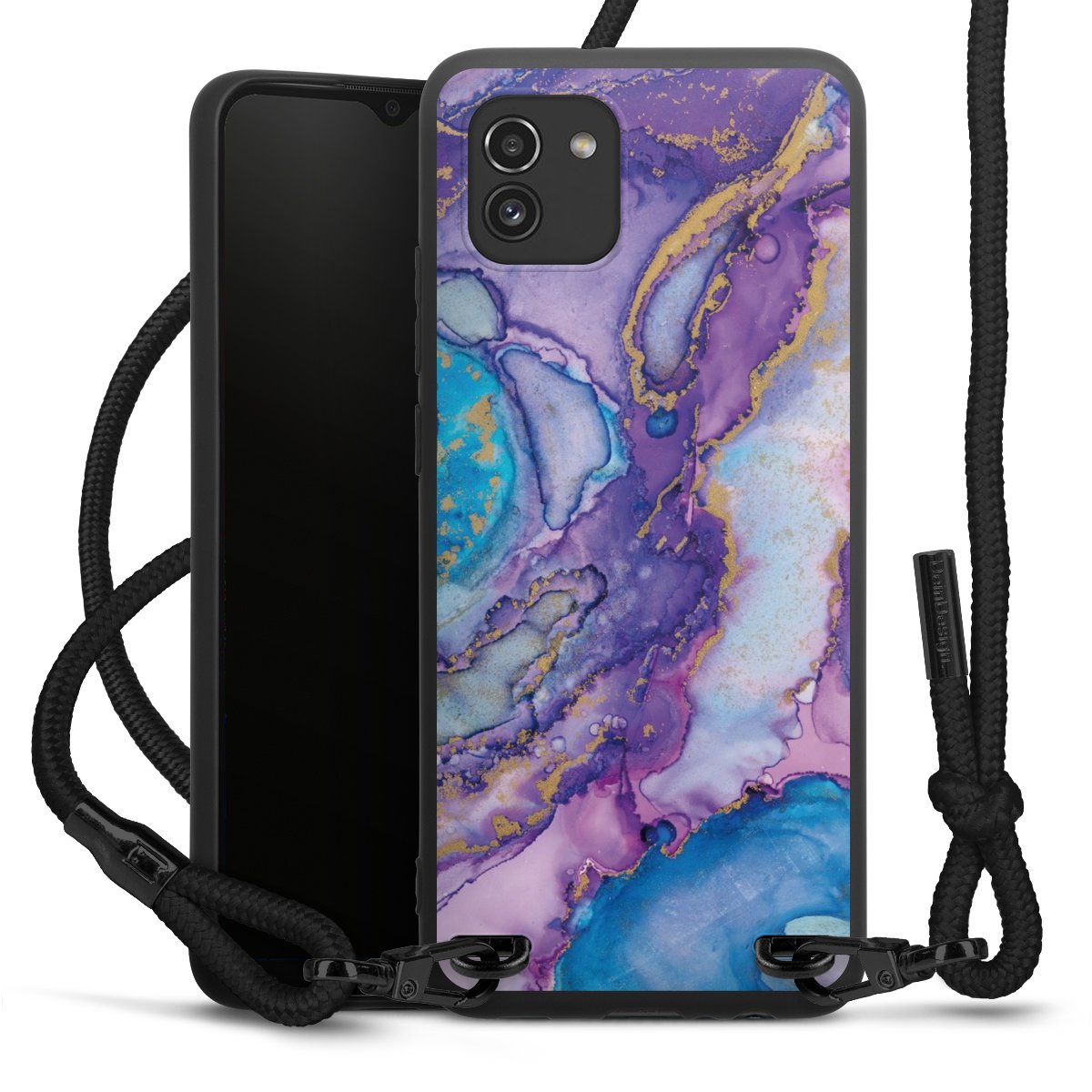 The matt black silicone case is made of flexible TPU (thermoplastic polyurethane) and offers robust protection. The durable, unbreakable material makes the cover flexible and dimensionally stable at the same time. The matte surface makes your design stand out more and is less susceptible to fingerprints and dirt. The stylish trend accessory fits comfortably in the hand and is perfectly complemented by the fabric (polyester) mobile phone strap. The braided fabric strap is approx. 1.70 metres long with a diameter of approx. 0.5 cm. Due to the special knotting technique, the length of the strap can be adjusted by simply pulling it, so that you can adapt it individually to your wishes. The practical case to wear around your neck is available with the fabric strap in black. As a little icing on the cake, we have provided the strap with a chic metal fastener in matt black. The strap is securely fastened to the case with loops made of high-quality genuine leather and press studs. The ends of the fabric strap are covered with metallic end caps and thus protected from fraying.