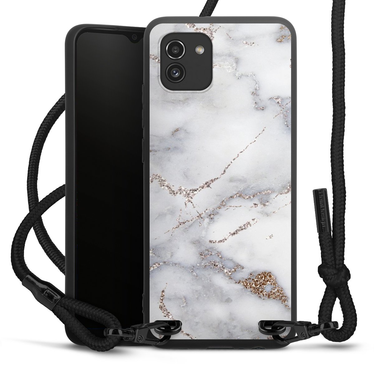 The matt black silicone case is made of flexible TPU (thermoplastic polyurethane) and offers robust protection. The durable, unbreakable material makes the cover flexible and dimensionally stable at the same time. The matte surface makes your design stand out more and is less susceptible to fingerprints and dirt. The stylish trend accessory fits comfortably in the hand and is perfectly complemented by the fabric (polyester) mobile phone strap. The braided fabric strap is approx. 1.70 metres long with a diameter of approx. 0.5 cm. Due to the special knotting technique, the length of the strap can be adjusted by simply pulling it, so that you can adapt it individually to your wishes. The practical case to wear around your neck is available with the fabric strap in black. As a little icing on the cake, we have provided the strap with a chic metal fastener in matt black. The strap is securely fastened to the case with loops made of high-quality genuine leather and press studs. The ends of the fabric strap are covered with metallic end caps and thus protected from fraying.