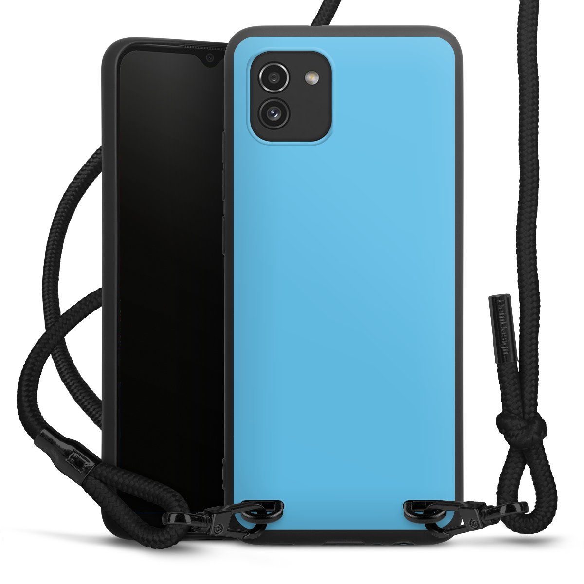 The matt black silicone case is made of flexible TPU (thermoplastic polyurethane) and offers robust protection. The durable, unbreakable material makes the cover flexible and dimensionally stable at the same time. The matte surface makes your design stand out more and is less susceptible to fingerprints and dirt. The stylish trend accessory fits comfortably in the hand and is perfectly complemented by the fabric (polyester) mobile phone strap. The braided fabric strap is approx. 1.70 metres long with a diameter of approx. 0.5 cm. Due to the special knotting technique, the length of the strap can be adjusted by simply pulling it, so that you can adapt it individually to your wishes. The practical case to wear around your neck is available with the fabric strap in black. As a little icing on the cake, we have provided the strap with a chic metal fastener in matt black. The strap is securely fastened to the case with loops made of high-quality genuine leather and press studs. The ends of the fabric strap are covered with metallic end caps and thus protected from fraying.