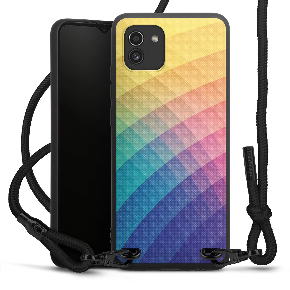 The matt black silicone case is made of flexible TPU (thermoplastic polyurethane) and offers robust protection. The durable, unbreakable material makes the cover flexible and dimensionally stable at the same time. The matte surface makes your design stand out more and is less susceptible to fingerprints and dirt. The stylish trend accessory fits comfortably in the hand and is perfectly complemented by the fabric (polyester) mobile phone strap. The braided fabric strap is approx. 1.70 metres long with a diameter of approx. 0.5 cm. Due to the special knotting technique, the length of the strap can be adjusted by simply pulling it, so that you can adapt it individually to your wishes. The practical case to wear around your neck is available with the fabric strap in black. As a little icing on the cake, we have provided the strap with a chic metal fastener in matt black. The strap is securely fastened to the case with loops made of high-quality genuine leather and press studs. The ends of the fabric strap are covered with metallic end caps and thus protected from fraying.