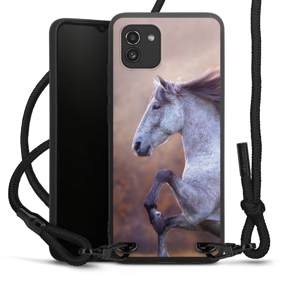 The matt black silicone case is made of flexible TPU (thermoplastic polyurethane) and offers robust protection. The durable, unbreakable material makes the cover flexible and dimensionally stable at the same time. The matte surface makes your design stand out more and is less susceptible to fingerprints and dirt. The stylish trend accessory fits comfortably in the hand and is perfectly complemented by the fabric (polyester) mobile phone strap. The braided fabric strap is approx. 1.70 metres long with a diameter of approx. 0.5 cm. Due to the special knotting technique, the length of the strap can be adjusted by simply pulling it, so that you can adapt it individually to your wishes. The practical case to wear around your neck is available with the fabric strap in black. As a little icing on the cake, we have provided the strap with a chic metal fastener in matt black. The strap is securely fastened to the case with loops made of high-quality genuine leather and press studs. The ends of the fabric strap are covered with metallic end caps and thus protected from fraying.