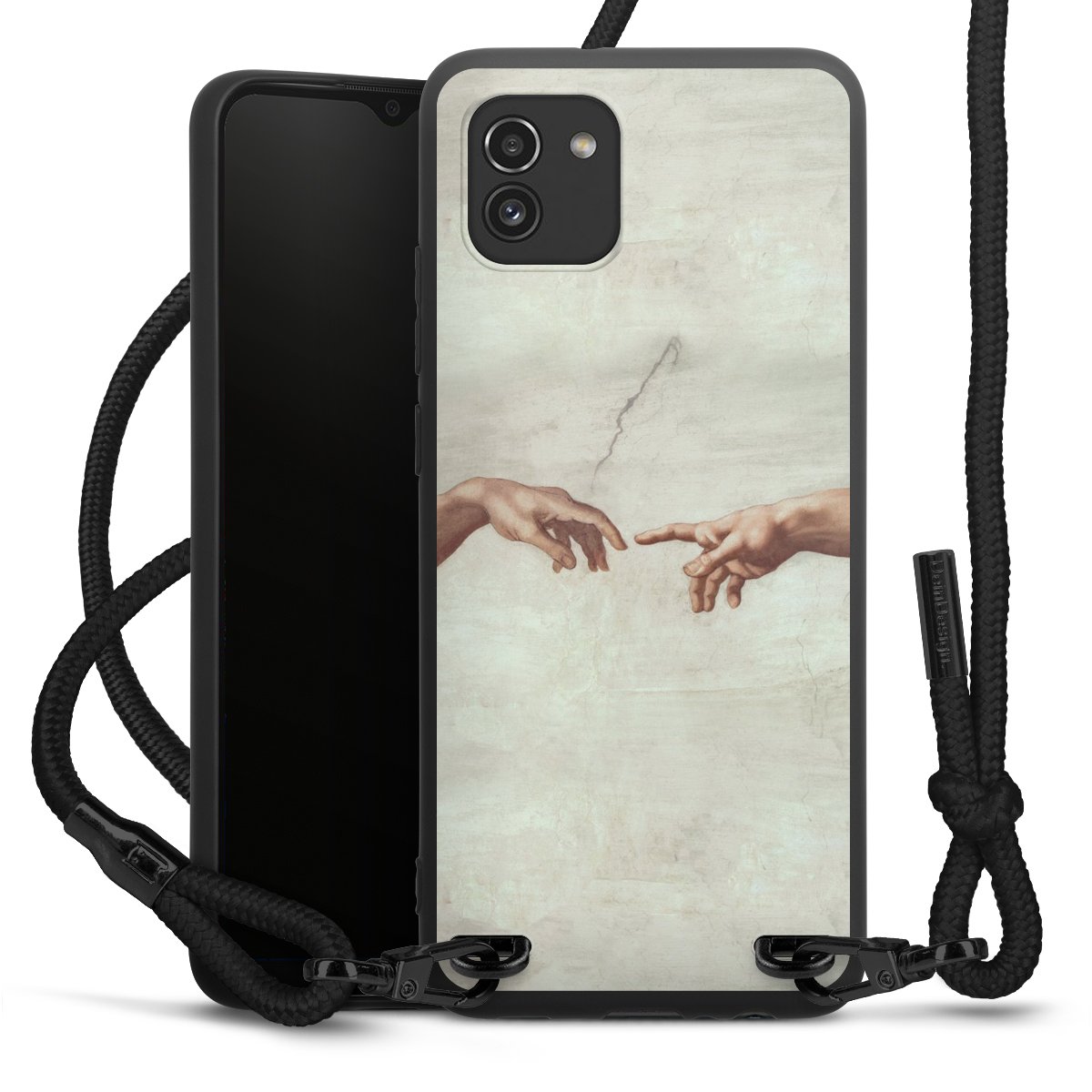 The matt black silicone case is made of flexible TPU (thermoplastic polyurethane) and offers robust protection. The durable, unbreakable material makes the cover flexible and dimensionally stable at the same time. The matte surface makes your design stand out more and is less susceptible to fingerprints and dirt. The stylish trend accessory fits comfortably in the hand and is perfectly complemented by the fabric (polyester) mobile phone strap. The braided fabric strap is approx. 1.70 metres long with a diameter of approx. 0.5 cm. Due to the special knotting technique, the length of the strap can be adjusted by simply pulling it, so that you can adapt it individually to your wishes. The practical case to wear around your neck is available with the fabric strap in black. As a little icing on the cake, we have provided the strap with a chic metal fastener in matt black. The strap is securely fastened to the case with loops made of high-quality genuine leather and press studs. The ends of the fabric strap are covered with metallic end caps and thus protected from fraying.