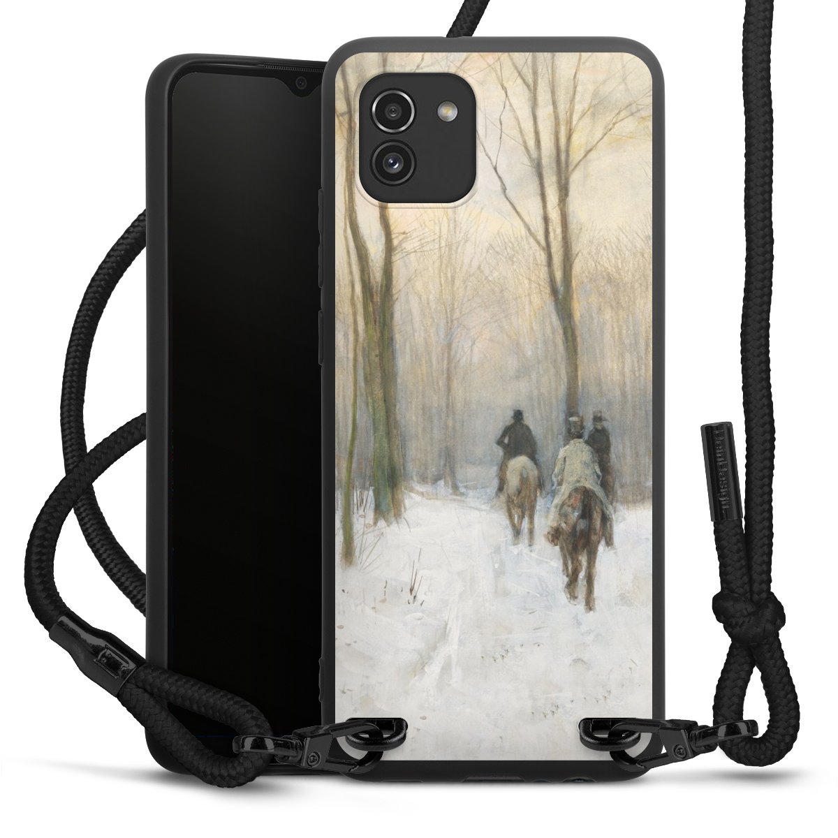 The matt black silicone case is made of flexible TPU (thermoplastic polyurethane) and offers robust protection. The durable, unbreakable material makes the cover flexible and dimensionally stable at the same time. The matte surface makes your design stand out more and is less susceptible to fingerprints and dirt. The stylish trend accessory fits comfortably in the hand and is perfectly complemented by the fabric (polyester) mobile phone strap. The braided fabric strap is approx. 1.70 metres long with a diameter of approx. 0.5 cm. Due to the special knotting technique, the length of the strap can be adjusted by simply pulling it, so that you can adapt it individually to your wishes. The practical case to wear around your neck is available with the fabric strap in black. As a little icing on the cake, we have provided the strap with a chic metal fastener in matt black. The strap is securely fastened to the case with loops made of high-quality genuine leather and press studs. The ends of the fabric strap are covered with metallic end caps and thus protected from fraying.