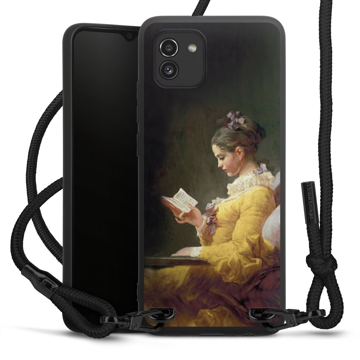 The matt black silicone case is made of flexible TPU (thermoplastic polyurethane) and offers robust protection. The durable, unbreakable material makes the cover flexible and dimensionally stable at the same time. The matte surface makes your design stand out more and is less susceptible to fingerprints and dirt. The stylish trend accessory fits comfortably in the hand and is perfectly complemented by the fabric (polyester) mobile phone strap. The braided fabric strap is approx. 1.70 metres long with a diameter of approx. 0.5 cm. Due to the special knotting technique, the length of the strap can be adjusted by simply pulling it, so that you can adapt it individually to your wishes. The practical case to wear around your neck is available with the fabric strap in black. As a little icing on the cake, we have provided the strap with a chic metal fastener in matt black. The strap is securely fastened to the case with loops made of high-quality genuine leather and press studs. The ends of the fabric strap are covered with metallic end caps and thus protected from fraying.