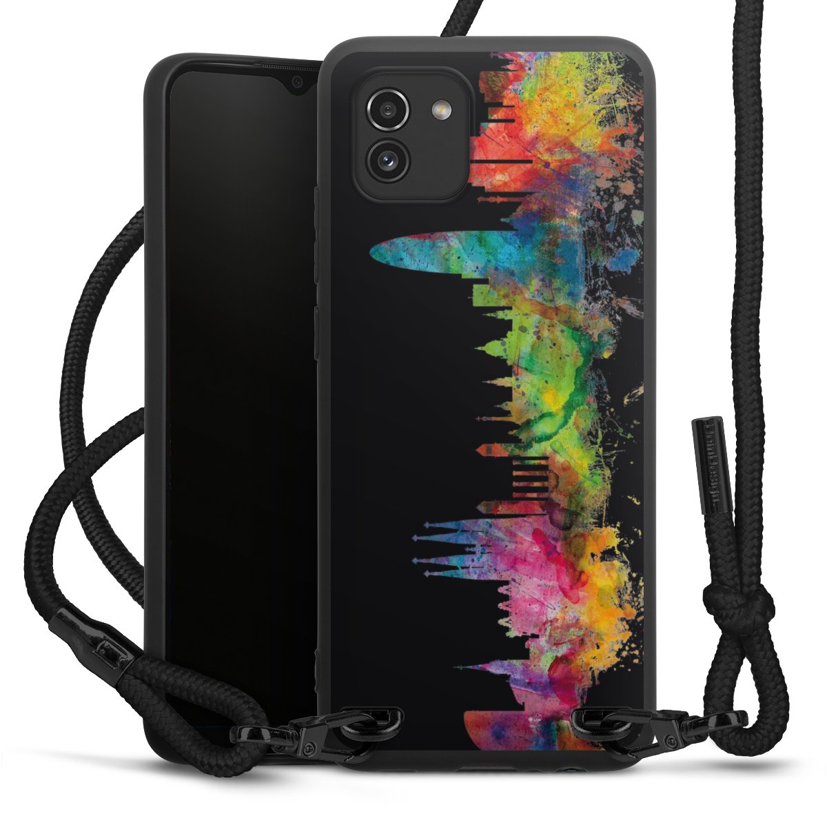 We use the solid direct print process for this phone case, which is why the print area only covers the back and the edge remains unprinted. The case to wear around your neck can be ordered unprinted, fully printed, or partially printed. For your design, either choose one of our exclusive shop motifs or get creative and create your own design, for example with photos and overlays. Design your own personal trend accessory and make an individual statement on the streets!