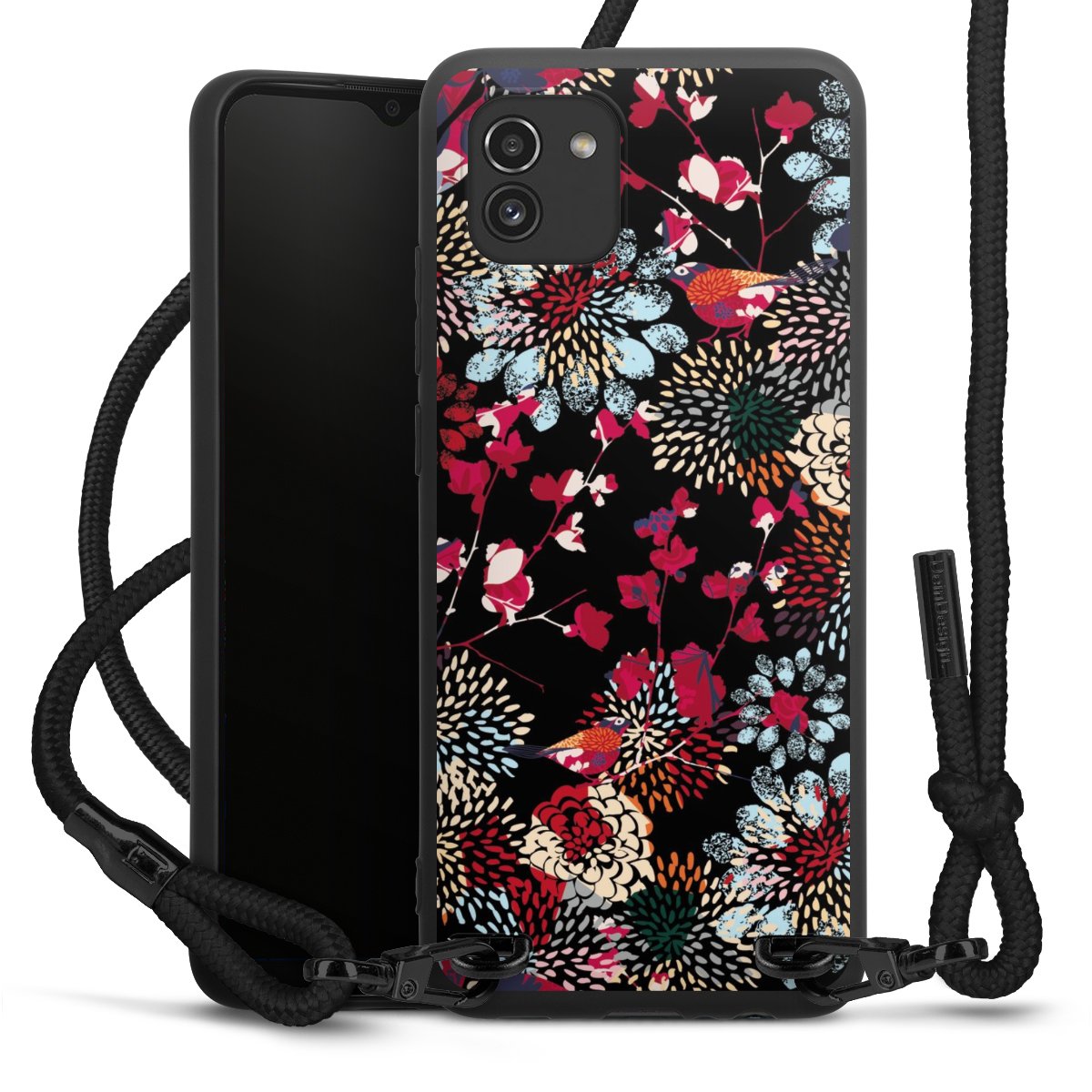 The matt black silicone case is made of flexible TPU (thermoplastic polyurethane) and offers robust protection. The durable, unbreakable material makes the cover flexible and dimensionally stable at the same time. The matte surface makes your design stand out more and is less susceptible to fingerprints and dirt. The stylish trend accessory fits comfortably in the hand and is perfectly complemented by the fabric (polyester) mobile phone strap. The braided fabric strap is approx. 1.70 metres long with a diameter of approx. 0.5 cm. Due to the special knotting technique, the length of the strap can be adjusted by simply pulling it, so that you can adapt it individually to your wishes. The practical case to wear around your neck is available with the fabric strap in black. As a little icing on the cake, we have provided the strap with a chic metal fastener in matt black. The strap is securely fastened to the case with loops made of high-quality genuine leather and press studs. The ends of the fabric strap are covered with metallic end caps and thus protected from fraying.