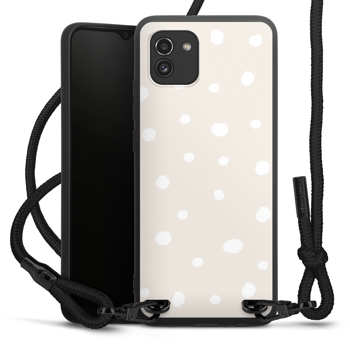 The matt black silicone case is made of flexible TPU (thermoplastic polyurethane) and offers robust protection. The durable, unbreakable material makes the cover flexible and dimensionally stable at the same time. The matte surface makes your design stand out more and is less susceptible to fingerprints and dirt. The stylish trend accessory fits comfortably in the hand and is perfectly complemented by the fabric (polyester) mobile phone strap. The braided fabric strap is approx. 1.70 metres long with a diameter of approx. 0.5 cm. Due to the special knotting technique, the length of the strap can be adjusted by simply pulling it, so that you can adapt it individually to your wishes. The practical case to wear around your neck is available with the fabric strap in black. As a little icing on the cake, we have provided the strap with a chic metal fastener in matt black. The strap is securely fastened to the case with loops made of high-quality genuine leather and press studs. The ends of the fabric strap are covered with metallic end caps and thus protected from fraying.