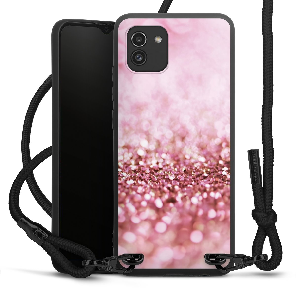 The matt black silicone case is made of flexible TPU (thermoplastic polyurethane) and offers robust protection. The durable, unbreakable material makes the cover flexible and dimensionally stable at the same time. The matte surface makes your design stand out more and is less susceptible to fingerprints and dirt. The stylish trend accessory fits comfortably in the hand and is perfectly complemented by the fabric (polyester) mobile phone strap. The braided fabric strap is approx. 1.70 metres long with a diameter of approx. 0.5 cm. Due to the special knotting technique, the length of the strap can be adjusted by simply pulling it, so that you can adapt it individually to your wishes. The practical case to wear around your neck is available with the fabric strap in black. As a little icing on the cake, we have provided the strap with a chic metal fastener in matt black. The strap is securely fastened to the case with loops made of high-quality genuine leather and press studs. The ends of the fabric strap are covered with metallic end caps and thus protected from fraying.