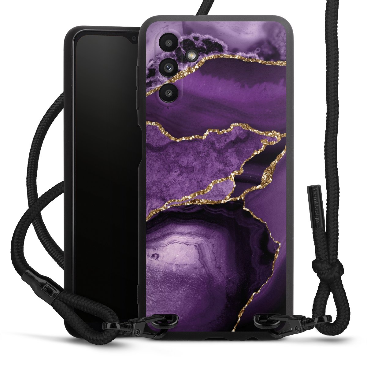 The matt black silicone case is made of flexible TPU (thermoplastic polyurethane) and offers robust protection. The durable, unbreakable material makes the cover flexible and dimensionally stable at the same time. The matte surface makes your design stand out more and is less susceptible to fingerprints and dirt. The stylish trend accessory fits comfortably in the hand and is perfectly complemented by the fabric (polyester) mobile phone strap. The braided fabric strap is approx. 1.70 metres long with a diameter of approx. 0.5 cm. Due to the special knotting technique, the length of the strap can be adjusted by simply pulling it, so that you can adapt it individually to your wishes. The practical case to wear around your neck is available with the fabric strap in black. As a little icing on the cake, we have provided the strap with a chic metal fastener in matt black. The strap is securely fastened to the case with loops made of high-quality genuine leather and press studs. The ends of the fabric strap are covered with metallic end caps and thus protected from fraying.