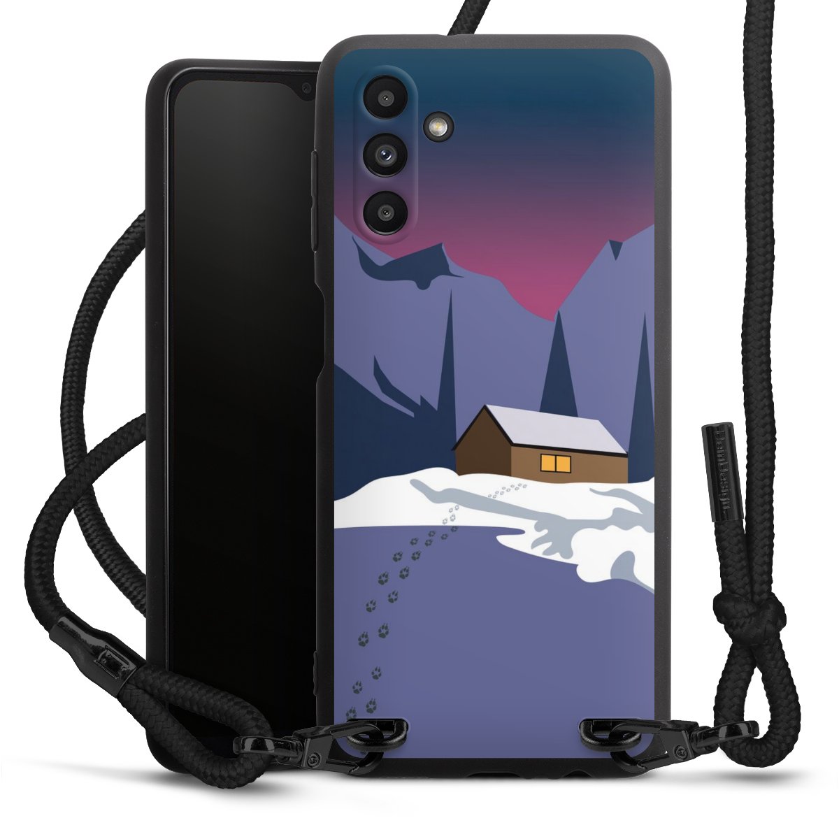 The matt black silicone case is made of flexible TPU (thermoplastic polyurethane) and offers robust protection. The durable, unbreakable material makes the cover flexible and dimensionally stable at the same time. The matte surface makes your design stand out more and is less susceptible to fingerprints and dirt. The stylish trend accessory fits comfortably in the hand and is perfectly complemented by the fabric (polyester) mobile phone strap. The braided fabric strap is approx. 1.70 metres long with a diameter of approx. 0.5 cm. Due to the special knotting technique, the length of the strap can be adjusted by simply pulling it, so that you can adapt it individually to your wishes. The practical case to wear around your neck is available with the fabric strap in black. As a little icing on the cake, we have provided the strap with a chic metal fastener in matt black. The strap is securely fastened to the case with loops made of high-quality genuine leather and press studs. The ends of the fabric strap are covered with metallic end caps and thus protected from fraying.