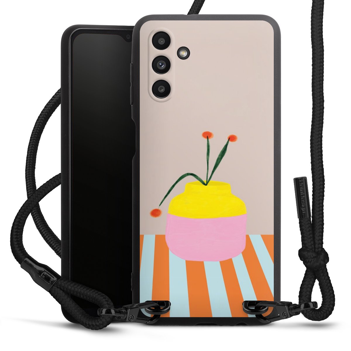The matt black silicone case is made of flexible TPU (thermoplastic polyurethane) and offers robust protection. The durable, unbreakable material makes the cover flexible and dimensionally stable at the same time. The matte surface makes your design stand out more and is less susceptible to fingerprints and dirt. The stylish trend accessory fits comfortably in the hand and is perfectly complemented by the fabric (polyester) mobile phone strap. The braided fabric strap is approx. 1.70 metres long with a diameter of approx. 0.5 cm. Due to the special knotting technique, the length of the strap can be adjusted by simply pulling it, so that you can adapt it individually to your wishes. The practical case to wear around your neck is available with the fabric strap in black. As a little icing on the cake, we have provided the strap with a chic metal fastener in matt black. The strap is securely fastened to the case with loops made of high-quality genuine leather and press studs. The ends of the fabric strap are covered with metallic end caps and thus protected from fraying.