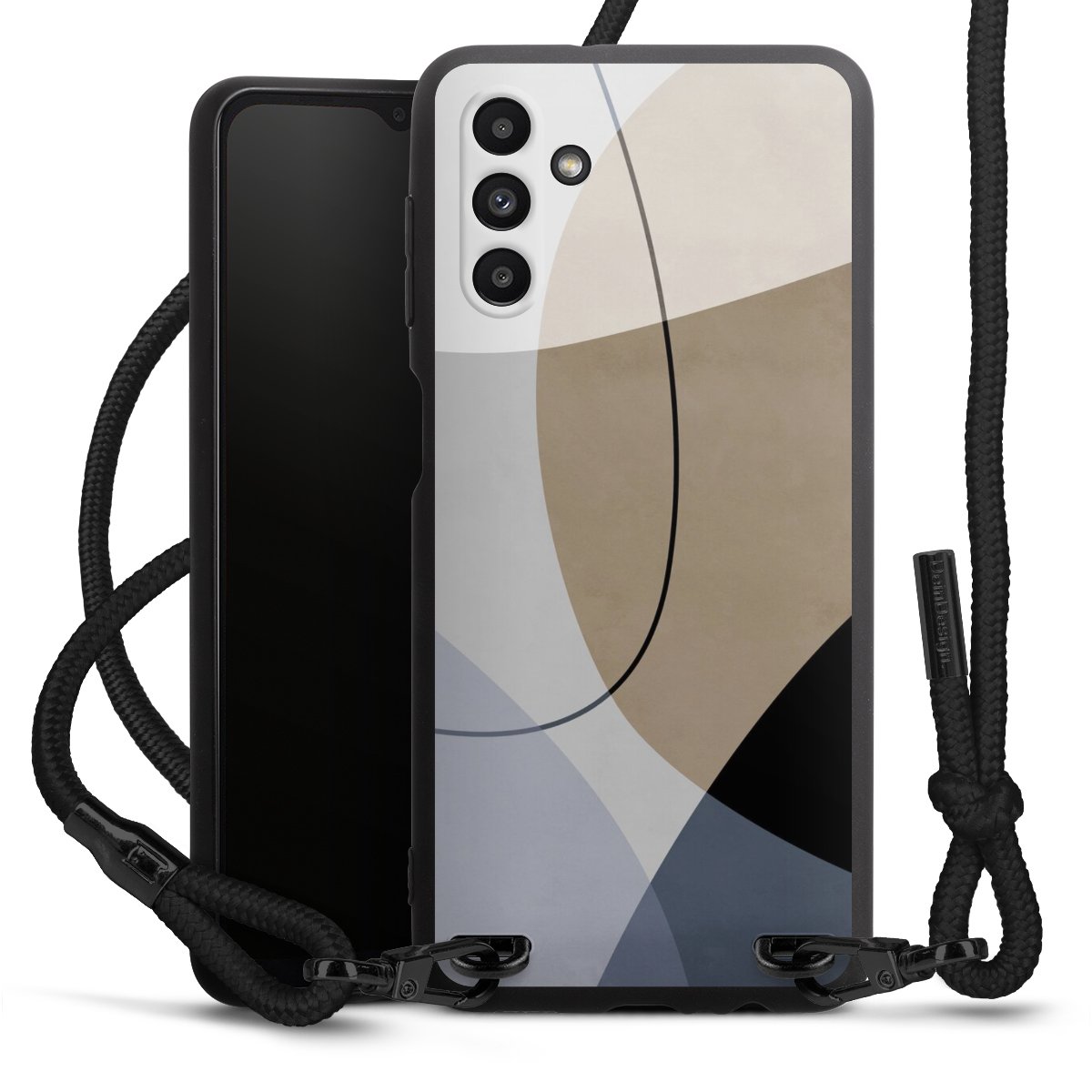 The matt black silicone case is made of flexible TPU (thermoplastic polyurethane) and offers robust protection. The durable, unbreakable material makes the cover flexible and dimensionally stable at the same time. The matte surface makes your design stand out more and is less susceptible to fingerprints and dirt. The stylish trend accessory fits comfortably in the hand and is perfectly complemented by the fabric (polyester) mobile phone strap. The braided fabric strap is approx. 1.70 metres long with a diameter of approx. 0.5 cm. Due to the special knotting technique, the length of the strap can be adjusted by simply pulling it, so that you can adapt it individually to your wishes. The practical case to wear around your neck is available with the fabric strap in black. As a little icing on the cake, we have provided the strap with a chic metal fastener in matt black. The strap is securely fastened to the case with loops made of high-quality genuine leather and press studs. The ends of the fabric strap are covered with metallic end caps and thus protected from fraying.