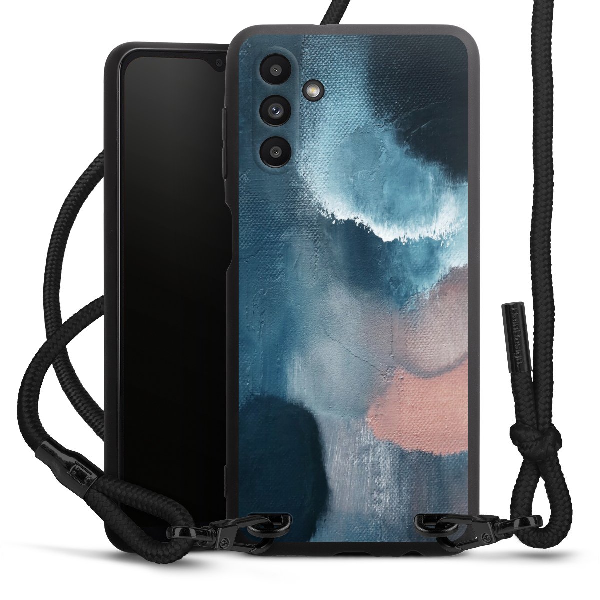The matt black silicone case is made of flexible TPU (thermoplastic polyurethane) and offers robust protection. The durable, unbreakable material makes the cover flexible and dimensionally stable at the same time. The matte surface makes your design stand out more and is less susceptible to fingerprints and dirt. The stylish trend accessory fits comfortably in the hand and is perfectly complemented by the fabric (polyester) mobile phone strap. The braided fabric strap is approx. 1.70 metres long with a diameter of approx. 0.5 cm. Due to the special knotting technique, the length of the strap can be adjusted by simply pulling it, so that you can adapt it individually to your wishes. The practical case to wear around your neck is available with the fabric strap in black. As a little icing on the cake, we have provided the strap with a chic metal fastener in matt black. The strap is securely fastened to the case with loops made of high-quality genuine leather and press studs. The ends of the fabric strap are covered with metallic end caps and thus protected from fraying.