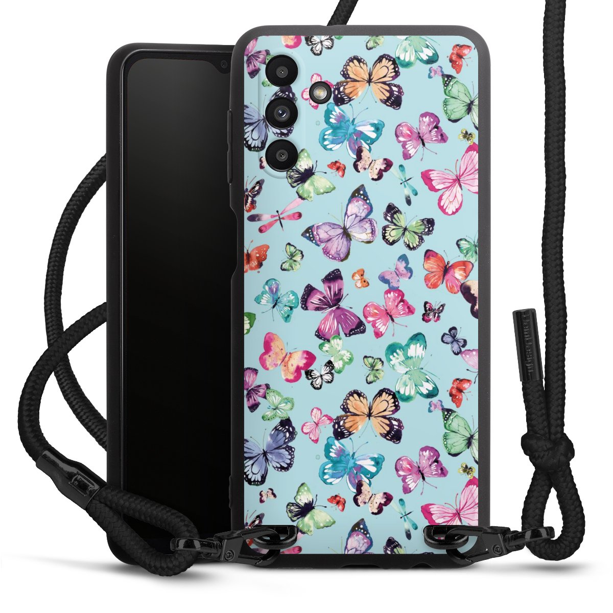 The matt black silicone case is made of flexible TPU (thermoplastic polyurethane) and offers robust protection. The durable, unbreakable material makes the cover flexible and dimensionally stable at the same time. The matte surface makes your design stand out more and is less susceptible to fingerprints and dirt. The stylish trend accessory fits comfortably in the hand and is perfectly complemented by the fabric (polyester) mobile phone strap. The braided fabric strap is approx. 1.70 metres long with a diameter of approx. 0.5 cm. Due to the special knotting technique, the length of the strap can be adjusted by simply pulling it, so that you can adapt it individually to your wishes. The practical case to wear around your neck is available with the fabric strap in black. As a little icing on the cake, we have provided the strap with a chic metal fastener in matt black. The strap is securely fastened to the case with loops made of high-quality genuine leather and press studs. The ends of the fabric strap are covered with metallic end caps and thus protected from fraying.