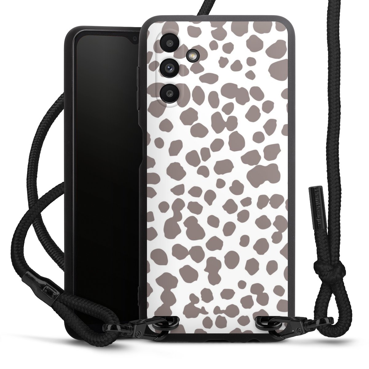 The matt black silicone case is made of flexible TPU (thermoplastic polyurethane) and offers robust protection. The durable, unbreakable material makes the cover flexible and dimensionally stable at the same time. The matte surface makes your design stand out more and is less susceptible to fingerprints and dirt. The stylish trend accessory fits comfortably in the hand and is perfectly complemented by the fabric (polyester) mobile phone strap. The braided fabric strap is approx. 1.70 metres long with a diameter of approx. 0.5 cm. Due to the special knotting technique, the length of the strap can be adjusted by simply pulling it, so that you can adapt it individually to your wishes. The practical case to wear around your neck is available with the fabric strap in black. As a little icing on the cake, we have provided the strap with a chic metal fastener in matt black. The strap is securely fastened to the case with loops made of high-quality genuine leather and press studs. The ends of the fabric strap are covered with metallic end caps and thus protected from fraying.