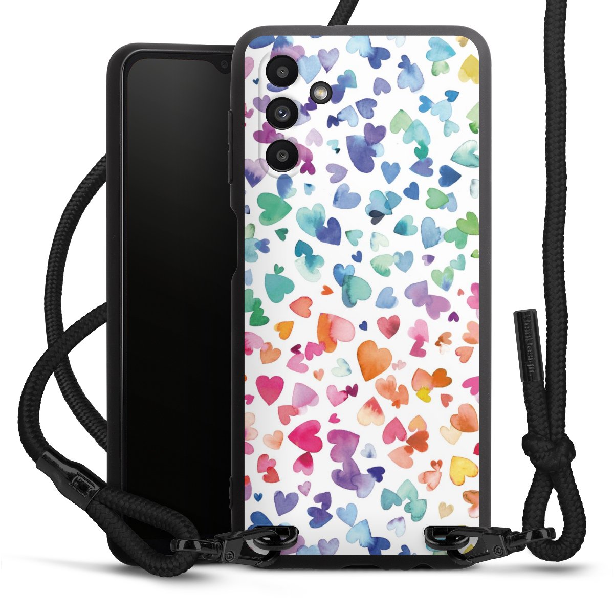 The matt black silicone case is made of flexible TPU (thermoplastic polyurethane) and offers robust protection. The durable, unbreakable material makes the cover flexible and dimensionally stable at the same time. The matte surface makes your design stand out more and is less susceptible to fingerprints and dirt. The stylish trend accessory fits comfortably in the hand and is perfectly complemented by the fabric (polyester) mobile phone strap. The braided fabric strap is approx. 1.70 metres long with a diameter of approx. 0.5 cm. Due to the special knotting technique, the length of the strap can be adjusted by simply pulling it, so that you can adapt it individually to your wishes. The practical case to wear around your neck is available with the fabric strap in black. As a little icing on the cake, we have provided the strap with a chic metal fastener in matt black. The strap is securely fastened to the case with loops made of high-quality genuine leather and press studs. The ends of the fabric strap are covered with metallic end caps and thus protected from fraying.