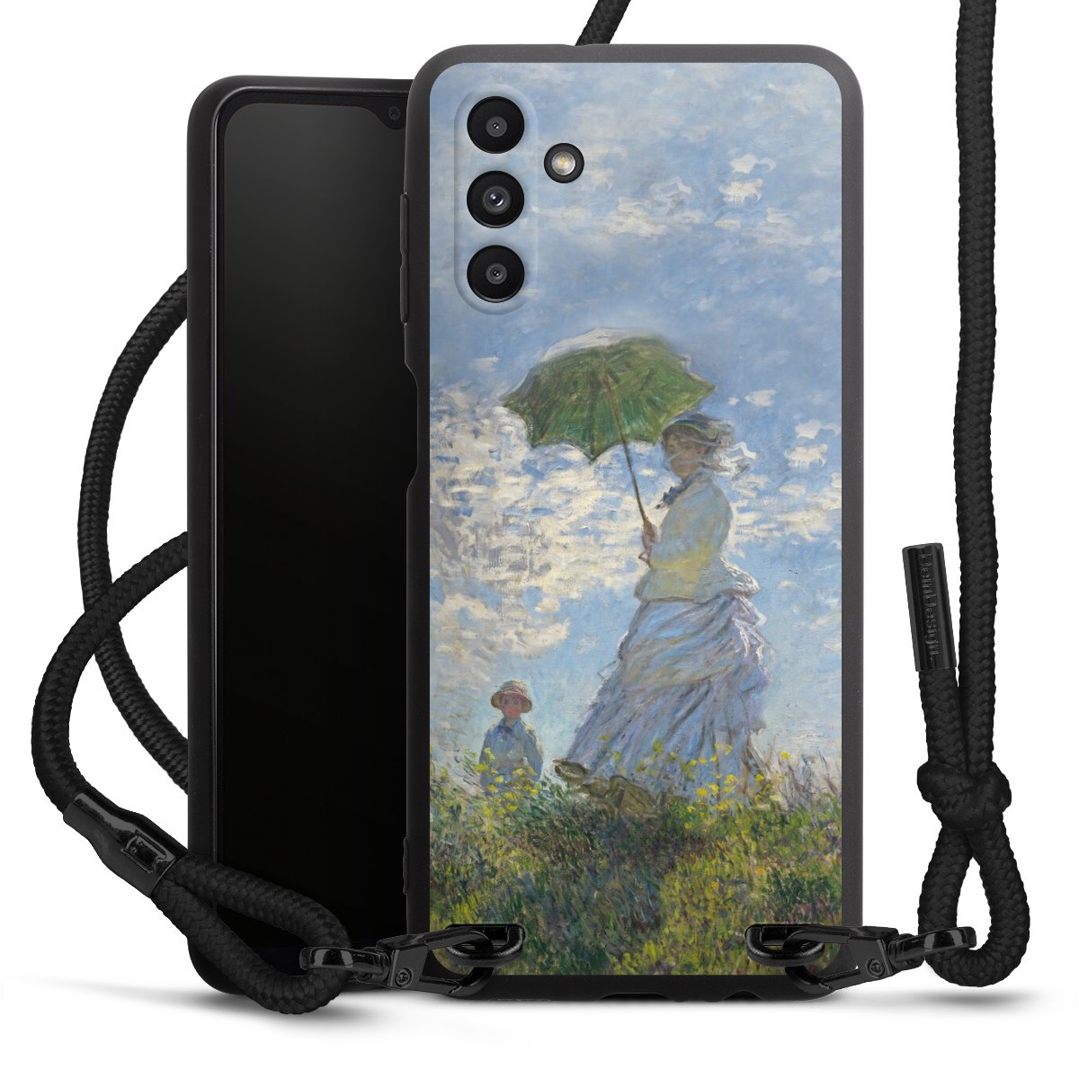The matt black silicone case is made of flexible TPU (thermoplastic polyurethane) and offers robust protection. The durable, unbreakable material makes the cover flexible and dimensionally stable at the same time. The matte surface makes your design stand out more and is less susceptible to fingerprints and dirt. The stylish trend accessory fits comfortably in the hand and is perfectly complemented by the fabric (polyester) mobile phone strap. The braided fabric strap is approx. 1.70 metres long with a diameter of approx. 0.5 cm. Due to the special knotting technique, the length of the strap can be adjusted by simply pulling it, so that you can adapt it individually to your wishes. The practical case to wear around your neck is available with the fabric strap in black. As a little icing on the cake, we have provided the strap with a chic metal fastener in matt black. The strap is securely fastened to the case with loops made of high-quality genuine leather and press studs. The ends of the fabric strap are covered with metallic end caps and thus protected from fraying.