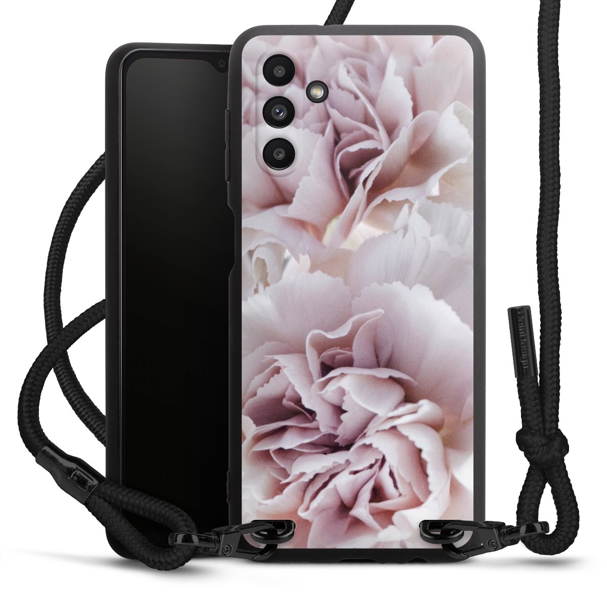 The matt black silicone case is made of flexible TPU (thermoplastic polyurethane) and offers robust protection. The durable, unbreakable material makes the cover flexible and dimensionally stable at the same time. The matte surface makes your design stand out more and is less susceptible to fingerprints and dirt. The stylish trend accessory fits comfortably in the hand and is perfectly complemented by the fabric (polyester) mobile phone strap. The braided fabric strap is approx. 1.70 metres long with a diameter of approx. 0.5 cm. Due to the special knotting technique, the length of the strap can be adjusted by simply pulling it, so that you can adapt it individually to your wishes. The practical case to wear around your neck is available with the fabric strap in black. As a little icing on the cake, we have provided the strap with a chic metal fastener in matt black. The strap is securely fastened to the case with loops made of high-quality genuine leather and press studs. The ends of the fabric strap are covered with metallic end caps and thus protected from fraying.