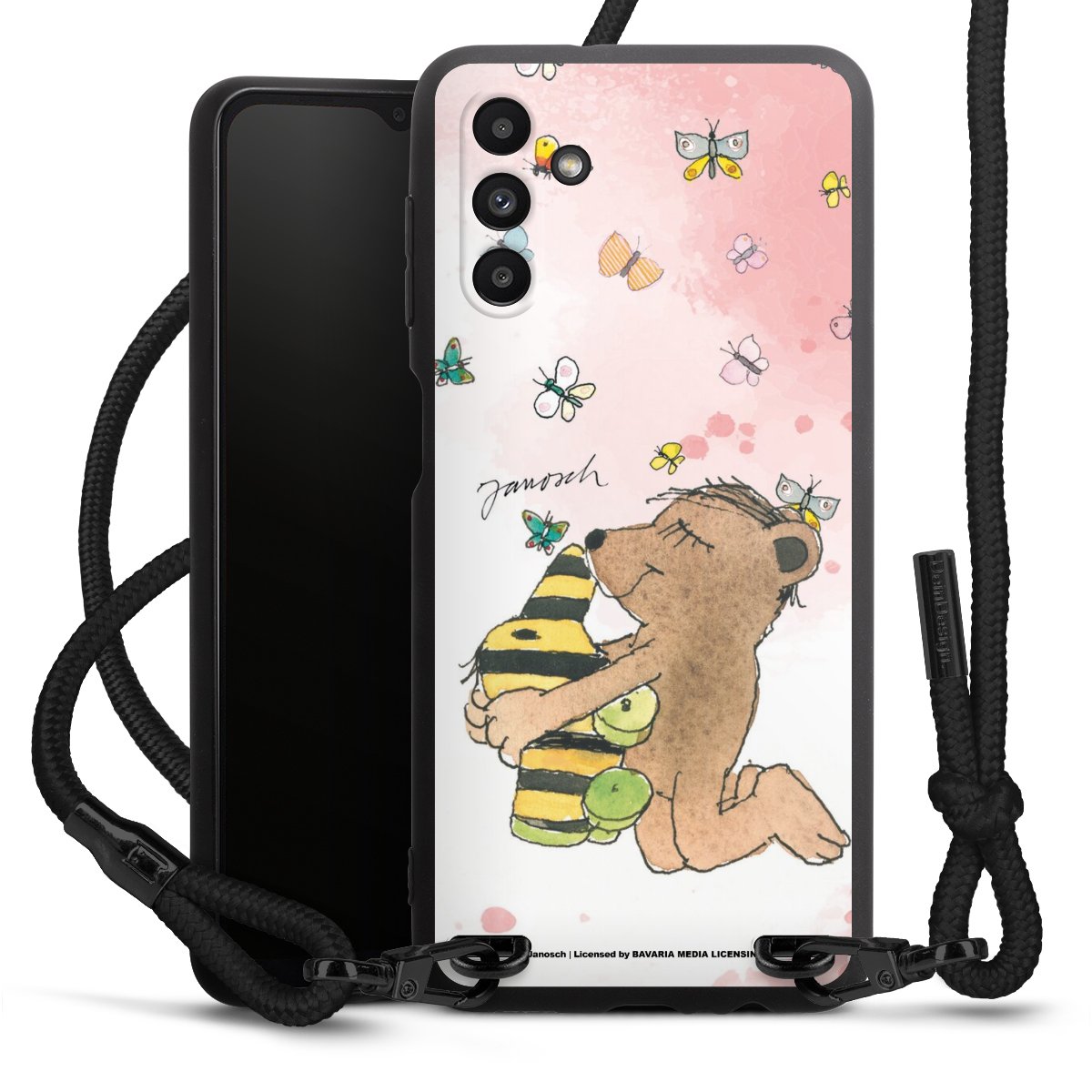 The matt black silicone case is made of flexible TPU (thermoplastic polyurethane) and offers robust protection. The durable, unbreakable material makes the cover flexible and dimensionally stable at the same time. The matte surface makes your design stand out more and is less susceptible to fingerprints and dirt. The stylish trend accessory fits comfortably in the hand and is perfectly complemented by the fabric (polyester) mobile phone strap. The braided fabric strap is approx. 1.70 metres long with a diameter of approx. 0.5 cm. Due to the special knotting technique, the length of the strap can be adjusted by simply pulling it, so that you can adapt it individually to your wishes. The practical case to wear around your neck is available with the fabric strap in black. As a little icing on the cake, we have provided the strap with a chic metal fastener in matt black. The strap is securely fastened to the case with loops made of high-quality genuine leather and press studs. The ends of the fabric strap are covered with metallic end caps and thus protected from fraying.