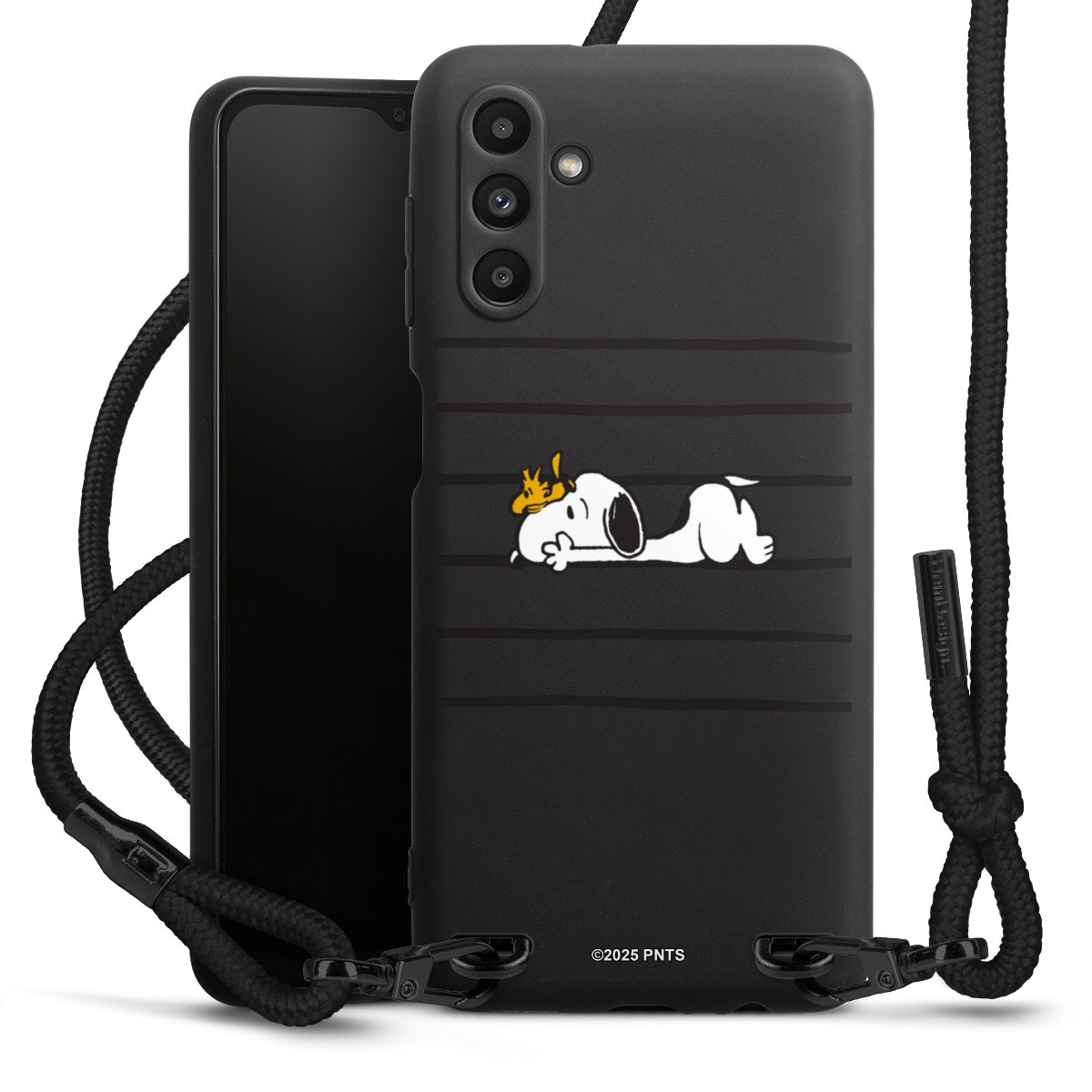 The matt black silicone case is made of flexible TPU (thermoplastic polyurethane) and offers robust protection. The durable, unbreakable material makes the cover flexible and dimensionally stable at the same time. The matte surface makes your design stand out more and is less susceptible to fingerprints and dirt. The stylish trend accessory fits comfortably in the hand and is perfectly complemented by the fabric (polyester) mobile phone strap. The braided fabric strap is approx. 1.70 metres long with a diameter of approx. 0.5 cm. Due to the special knotting technique, the length of the strap can be adjusted by simply pulling it, so that you can adapt it individually to your wishes. The practical case to wear around your neck is available with the fabric strap in black. As a little icing on the cake, we have provided the strap with a chic metal fastener in matt black. The strap is securely fastened to the case with loops made of high-quality genuine leather and press studs. The ends of the fabric strap are covered with metallic end caps and thus protected from fraying.