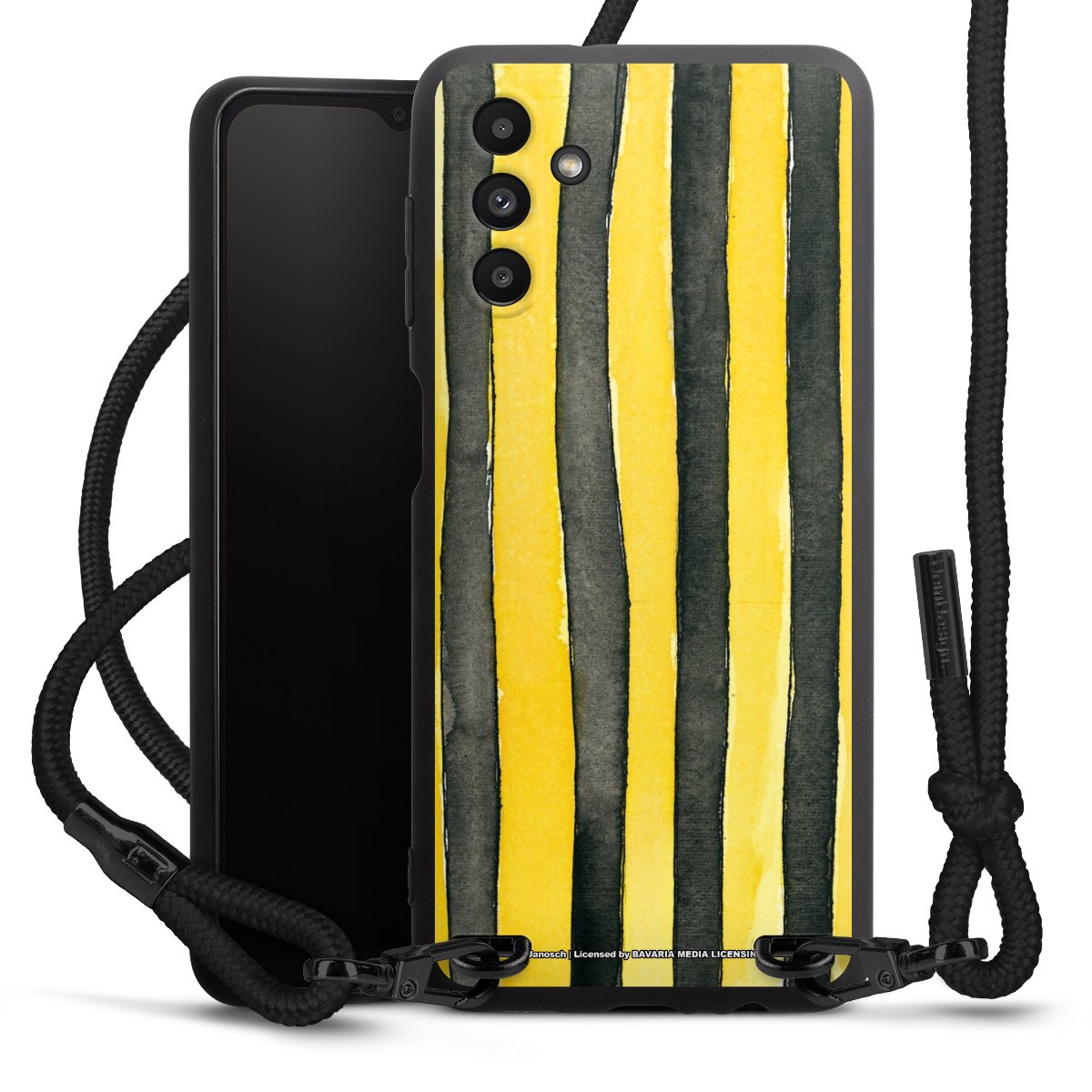 The matt black silicone case is made of flexible TPU (thermoplastic polyurethane) and offers robust protection. The durable, unbreakable material makes the cover flexible and dimensionally stable at the same time. The matte surface makes your design stand out more and is less susceptible to fingerprints and dirt. The stylish trend accessory fits comfortably in the hand and is perfectly complemented by the fabric (polyester) mobile phone strap. The braided fabric strap is approx. 1.70 metres long with a diameter of approx. 0.5 cm. Due to the special knotting technique, the length of the strap can be adjusted by simply pulling it, so that you can adapt it individually to your wishes. The practical case to wear around your neck is available with the fabric strap in black. As a little icing on the cake, we have provided the strap with a chic metal fastener in matt black. The strap is securely fastened to the case with loops made of high-quality genuine leather and press studs. The ends of the fabric strap are covered with metallic end caps and thus protected from fraying.