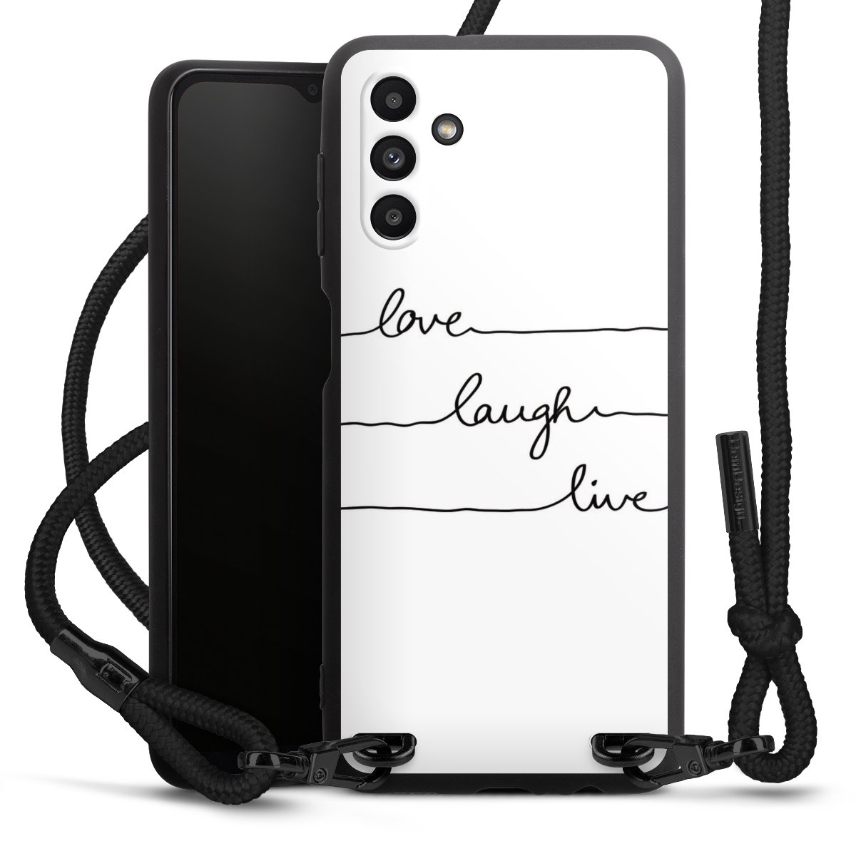 The matt black silicone case is made of flexible TPU (thermoplastic polyurethane) and offers robust protection. The durable, unbreakable material makes the cover flexible and dimensionally stable at the same time. The matte surface makes your design stand out more and is less susceptible to fingerprints and dirt. The stylish trend accessory fits comfortably in the hand and is perfectly complemented by the fabric (polyester) mobile phone strap. The braided fabric strap is approx. 1.70 metres long with a diameter of approx. 0.5 cm. Due to the special knotting technique, the length of the strap can be adjusted by simply pulling it, so that you can adapt it individually to your wishes. The practical case to wear around your neck is available with the fabric strap in black. As a little icing on the cake, we have provided the strap with a chic metal fastener in matt black. The strap is securely fastened to the case with loops made of high-quality genuine leather and press studs. The ends of the fabric strap are covered with metallic end caps and thus protected from fraying.