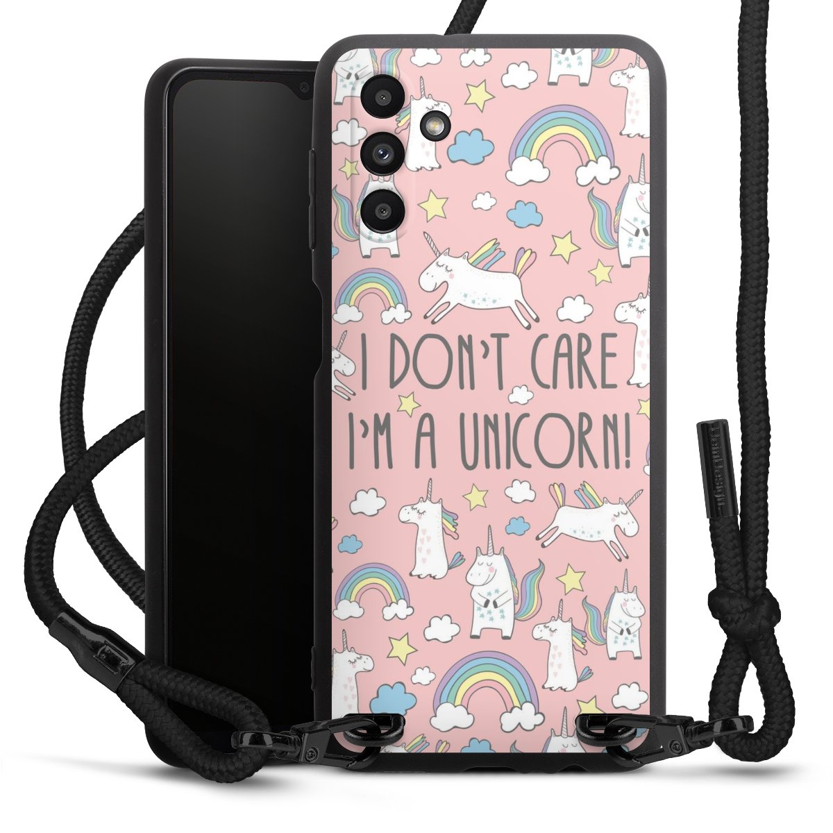 The matt black silicone case is made of flexible TPU (thermoplastic polyurethane) and offers robust protection. The durable, unbreakable material makes the cover flexible and dimensionally stable at the same time. The matte surface makes your design stand out more and is less susceptible to fingerprints and dirt. The stylish trend accessory fits comfortably in the hand and is perfectly complemented by the fabric (polyester) mobile phone strap. The braided fabric strap is approx. 1.70 metres long with a diameter of approx. 0.5 cm. Due to the special knotting technique, the length of the strap can be adjusted by simply pulling it, so that you can adapt it individually to your wishes. The practical case to wear around your neck is available with the fabric strap in black. As a little icing on the cake, we have provided the strap with a chic metal fastener in matt black. The strap is securely fastened to the case with loops made of high-quality genuine leather and press studs. The ends of the fabric strap are covered with metallic end caps and thus protected from fraying.